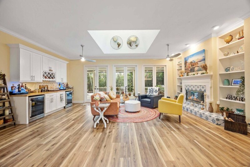 This exceptional one of a kind custom-designed home by London Bay Homes is in the prestigious Lakemont neighborhood of Pelican Landing. At the end of a private, beautifully landscaped cul-de-sac, the four-bedroom, 2.5-bath residence backs up to a pristine, environmentally protected reserve, offering unparalleled privacy and tranquility. As you approach the home, you're welcomed by lush landscaping and charming woodwork leading to an extended front porch. Upon entering, you're greeted by a sun-filled gathering room, where three French doors frame a stunning view of what may be the largest covered poolside entertaining area in the community. Spanning the entire rear of the home, this expansive outdoor space is enhanced by skylights and an inviting atmosphere ideal for gatherings. Inside, the home features a tastefully updated kitchen with a new center island range, refrigerator and tile backsplash, as well as updated baths and new flooring throughout the living areas. Additional upgrades include newer roll-down hurricane shutters, a new 2024 air-conditioning system, a new tankless water heater, epoxy garage flooring, new pool filter and equipment, and new lighting and fans. The living room now boasts a custom-built bar with wine and beverage coolers. The home also includes a new washer and dryer in 2024, reverse osmosis system and water softener. Pelican Landing offers an array of world-class amenities. The Nest Golf Club is home to two meticulously maintained 18-hole courses, offering a variety of shot values and consistent playability. A 34-acre private island beach club, gulf access for sailing and kayaking, 12 Har-Tru tennis courts, a fitness center, bocce, pickleball, tennis, and a wide range of recreational and educational activities are offered. It's a beautiful lifestyle!.