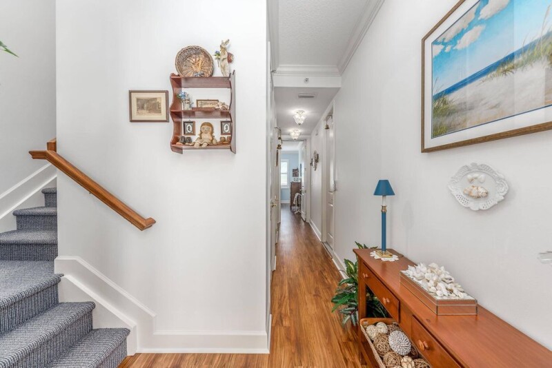 Paradise awaits in this highly sought-after, updated three-story townhouse. Featuring 10' ceilings throughout and a private elevator, this exquisite home offers stunning ocean views from two of its three private balconies. The interiors showcase luxury vinyl wood flooring, plantation shutters, and crown molding throughout. The first floor includes a private guest suite with a full bath. Ascend to the second floor via elevator or stairs to discover a spacious open living and dining area, a den, and a laundry room, perfect for effortless entertaining. The updated kitchen shines with elegant white cabinetry extending to the ceiling, granite countertops, and stainless steel appliances. The third floor is a luxurious retreat featuring a large master suite with custom shelving in the walk-in.