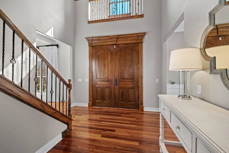 Discover unparalleled luxury in this stunning 5-bedroom, 4.5-bathroom brick estate spanning 5,681 sq ft on 5.81 private wooded acres in prestigious Talamore neighborhood with Bentonville schools. This sophisticated residence features soaring coffered ceilings, rich hardwood floors, and custom millwork throughout. The gourmet kitchen showcases premium stainless appliances, black granite countertops, and custom white cabinetry opening to bright living spaces with multiple fireplaces. Entertainment options abound with a professional home theater, wet bar with wine refrigerator and resort-style pool. Retreat to the primary suite with spa bathroom featuring large walk-in shower and bathtub. Additional highlights include built-in bookshelves, abundant natural light from oversized windows, multiple outdoor living areas and professional landscaping with stone accents. This extraordinary property perfectly balances elegant design and modern convenience in a tranquil setting while offering convenient access to Bentonville amenities.