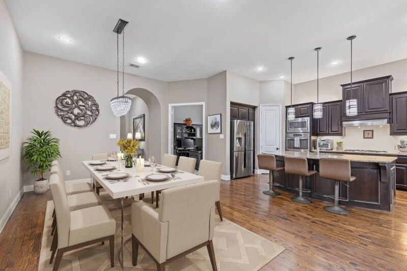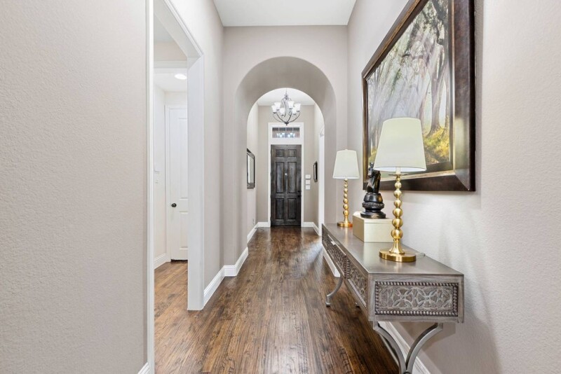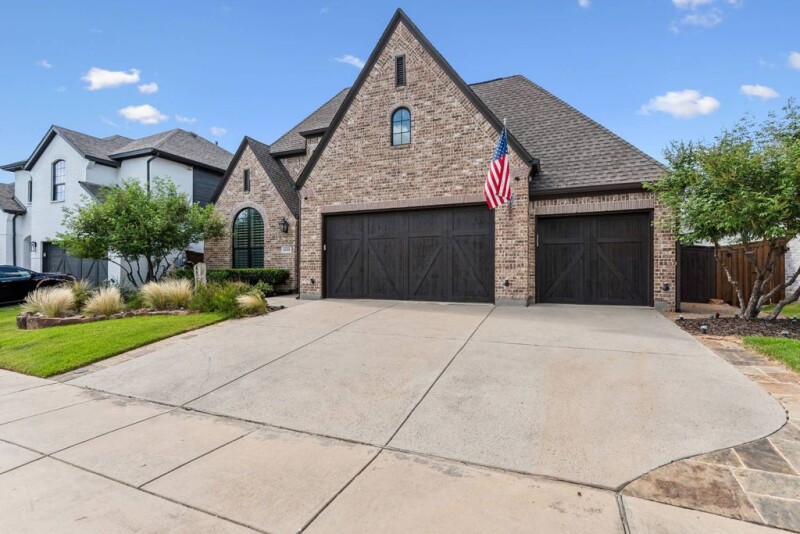 ONE STORY, PROSPER ISD, HEATED POOL, HIGHLAND HOME IN GRAHAM PHASE OF LIGHT FARMS! Step into luxury in this stunning home boasting over $210,000 in recent improvement, in addition to extensive custom-built upgrades! The backyard is a true oasis, featuring a 16k-gallon heated pool with a tanning ledge, programmable LED lighting, waterfall and firepit wall, and Caribbean blue pebble surface—all controlled via wireless app. Complemented by extended decking, artificial turf and shade canopy, this backyard redefines outdoor living. The home shines with handscraped hardwood floors, 8 foot solid doors, 11 wired security cameras, and custom lighting both inside and out. Upgraded interiors include an expansive kitchen with extended granite countertops, upgraded Knotty Alder cabinetry, double ovens, stainless steel appliances including 5 burner gas cooktop, vented hood, and pendant lighting. The open floor plan has abundance of natural light thanks to premium elevation and high ceilings throughout. The home features an oversized 3 car garage with cedar insulated doors, and added features like a mini-split system, wall mounted TV, water softener, sink, cabinetry, epoxy flooring, and doggie door. The two-car bay has an 8-foot header, built specifically for a lifted pick up and boat storage. The tech-savvy buyer will appreciate the smart home system controlling cameras, pool equipment, HVAC, and more directly from your phone. Other highlights include a Rinnai tankless water heater, plantation shutters, fresh paint, Rachio sprinkler controller, French doors to the office, and a second washer-dryer hookup in the garage. Designed for entertaining, the home also features a media room pre-wired for surround sound. This property sits on a premium extended lot, complete with professional landscaping, stone hardscaping, and additional exterior lighting.