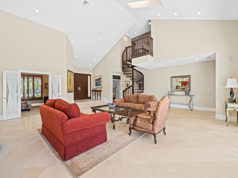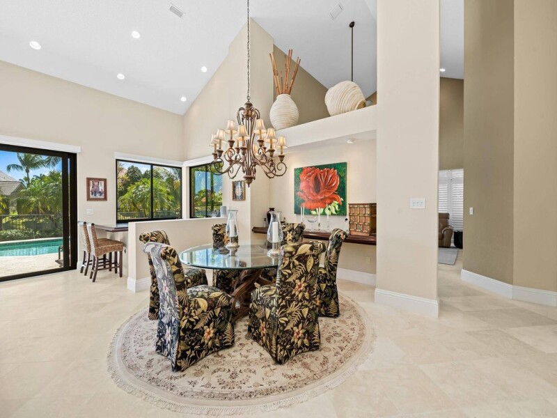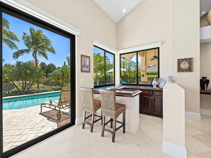 Exceptional estate home in Encantada - Boca Pointe with 4009 sqft under air offers a perfect blend of luxury, comfort and breathtaking lake views. Upon entering you will be captivated by the soaring ceilings and spacious living area. Property features three bedrooms with one bedroom, full bath and den upstairs perfect for family or guest. All bedrooms have luxuriously renovated en suite bathrooms. Additional features include living room, dining area, den and family room overlooking a renovated kitchen, marble floors throughout living area, impact windows and doors, travertine circular driveway. Enjoy the indoor/outdoor lifestyle this home offers with an expansive patio and pool/spa area with a cabana bath overlooking a serene lake view. Boca Pointe is a NON-mandatory country club.