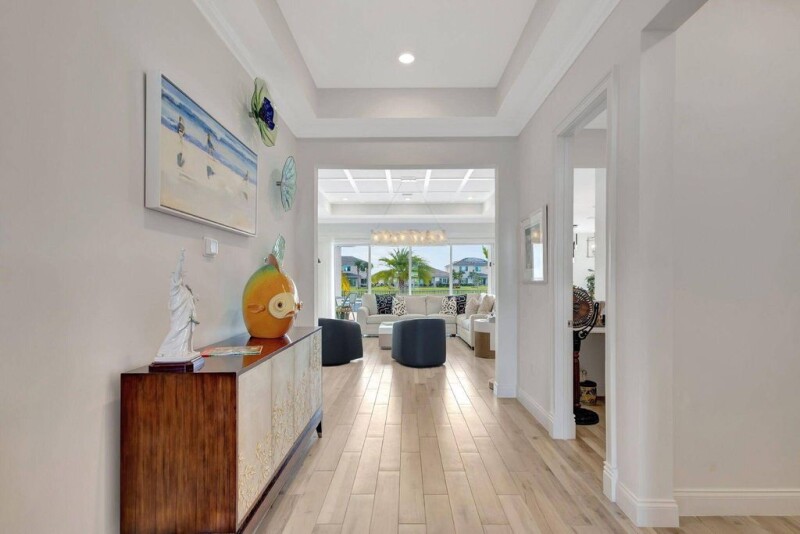 Discover this 2023 custom-built estate featuring a saltwater gas pool and spa, combining resort-style living with elegant design. The open floor plan includes a spacious living room, a stunning kitchen with a quartz island, Monogram GE appliances, and custom cabinetry. Tray ceilings, crown molding, and upscale finishes elevate the space. Enjoy serene lake views from the dining room, and relax in the living room with its custom wall design and fireplace. The home offers four bedrooms, a bonus room, and 3.5 baths, including a luxurious primary suite with a soaking tub and walk-in closet.Features:Custom saltwater gas pool and spa3-car garage with epoxy flooring.Smart blinds and impact windows.$200k outdoor upgrades with Italian marble finishes.Schedule your private tour today!.