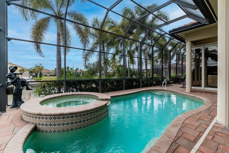 Exceptional direct access home with southwest exposure on oversized lot in desirable Marco River area. Quick access to the gulf or backwaters. Spacious one level home, three bedrooms, three baths plus den/office. Large primary suite with second primary suite and third guest bedroom affords ample space for visiting family or friends. Soaring coffered ceilings, full-height glass, plantation shutters, electronic blinds, nicely furnished with ease of maintenance tile floors throughout. Open floor plan with large family room adjacent to kitchen area for casual gatherings or movie night, and formal living and dining room. Home has been meticulously maintained with many improvements. Large screened lanai pool and spa for outside living and entertaining. Dock with plenty of sundeck area and platform kayak lift for the boater or day kayaker. Lush tropical landscaping and exterior lighting. Neutral color pallet. Enjoy the colorful skies at sunset, relax on the lanai or in your private spa with your favorite libation. Quick and easy access to Marco River, Gulf of Mexico or endless canals and backwaters for the boater or kayaker. An extraordinary waterfront lifestyle awaits! New roof 2018 , New A/C 2022.