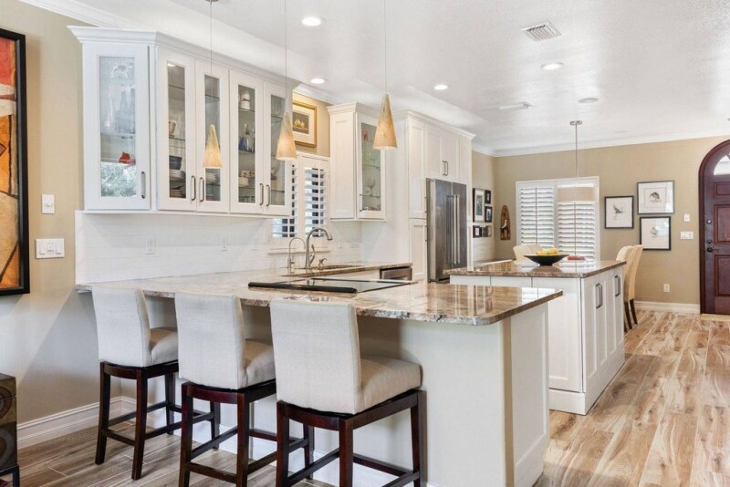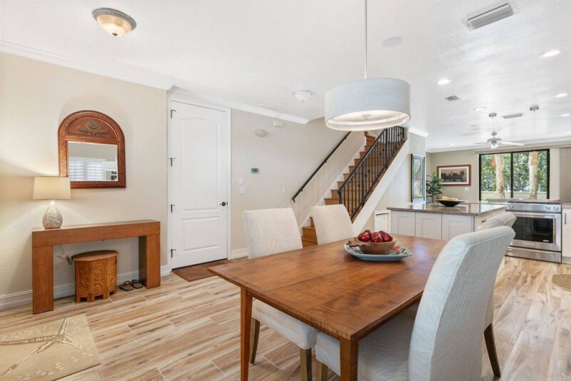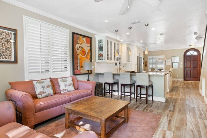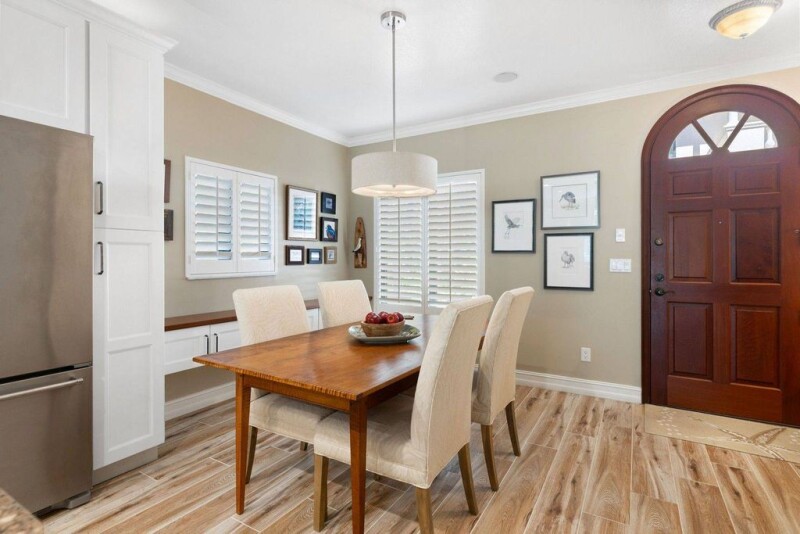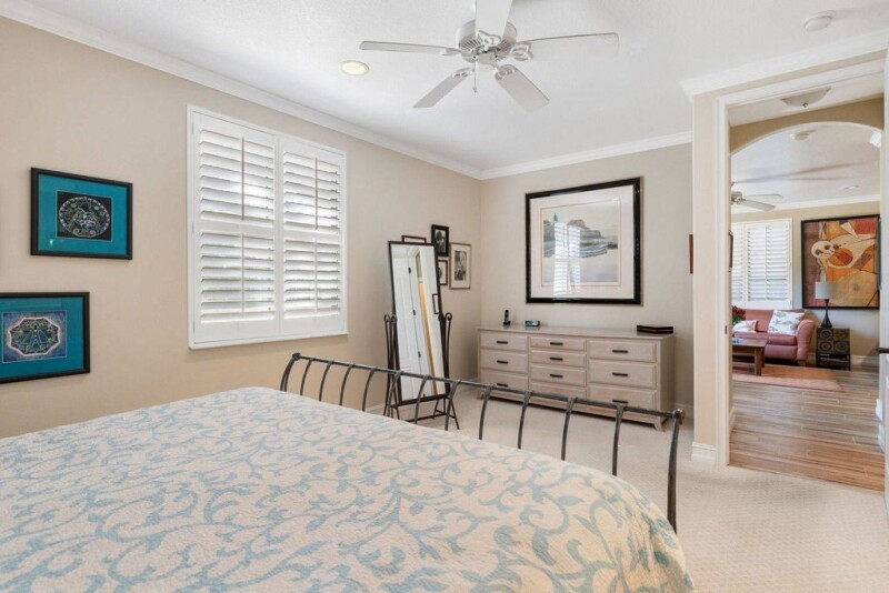 Updated and centrally located Villa Solana townhome featuring wood-look tile floors, crown molding throughout, and plantation shutters. 4 bedrooms including the downstairs primary, 3.5 baths, and 2-car garage with built-in storage. The open kitchen features granite counters and updated shaker-style cabinetry. Upstairs, the expansive family room with high ceilings, full bath, and built-in bar can be converted into a large primary suite. Additional features include an office, two laundry areas, and multiple Juliet balconies. The walled courtyard is perfect for al fresco dining.