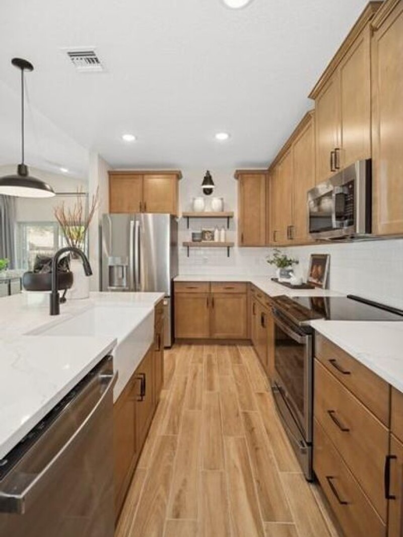 The Passionflower II offers a variety of thoughtful features designed for comfort and convenience. The kitchen is highlighted by Sinclair White cabinetry, giving it a timeless and elegant look. This home features an Extra Suite Plus with a private bath and kitchenette, making it perfect for guests or multi-generational living. A vaulted ceiling unites the great room and dining area, creating a spacious and open atmosphere. The covered patio, easily accessible from the great room, is ideal for indoor-outdoor living. The primary suite is both spacious and functional, with a walk-in closet and dual vanities in the primary bath that streamline busy mornings. Additionally, the T-Turn Driveway enhances convenience for parking and maneuvering vehicles.