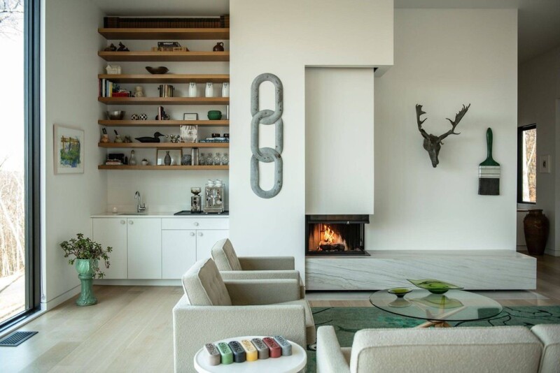 Up a winding country drive in a beautifully rural part of southern Columbia County, a modern house is notched into the hillside. West facing toward the sunset, the home was built to frame a magnificent view of the Catskill Mountains. The interior has wonderfully high 12ft ceilings and wideboard white oak flooring. The large Great Room features a striking wall of glass looking out over the landscape. In the open kitchen you'll find a Sub-Zero refrigerator and Wolf range, and at the far end of the room is a woodburning fireplace and wet bar. There are four ensuite bedrooms including a beautiful primary suite, all with big views, and downstairs the finished lower level has radiant concrete floors, a sauna and a media room. The systems are top of the line with geothermal heating and cooling. The pool is heated with a big view, and the pool house has shiplap white walls, concrete floors and two built in queen daybeds. There is a kitchenette and a full bath with a shower. The house is completely private with no neighbors in sight. The two car garage is currently set up as a gym & garage space. Completely turn key, well executed modern luxury just 2h north of NYC.
