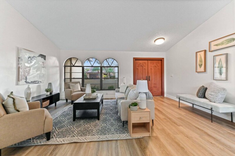 This stunning lakefront pool home in the desirable Lakewood Oaks community offers the perfect blend of elegance, comfort, and breathtaking water views. Recently remodeled with brand new floors featuring 4 bedrooms and 2.5 bathrooms, this spacious residence welcomes you with a circular driveway leading to a 2-car garage. Inside, vaulted ceilings and an open-concept living, dining, and kitchen area create an airy and inviting atmosphere. The family room, bathed in natural light, seamlessly connects to the outdoor oasis through sliding glass doors, making indoor-outdoor living a breeze. The kitchen is a chef's dream, boasting white shaker cabinets, ample storage, and a functional layout perfect for entertaining.