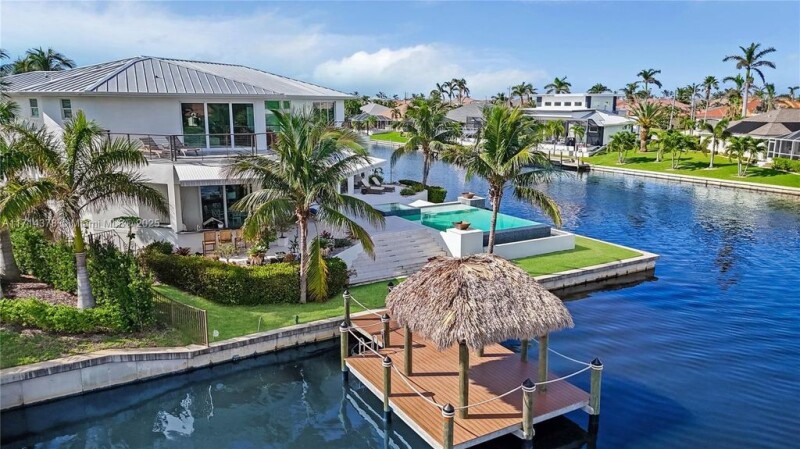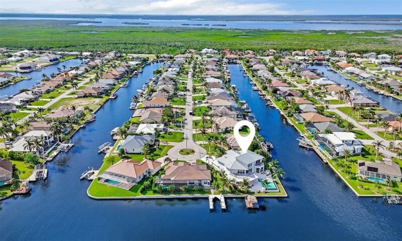 Discover this 2018 custom-built luxury estate in SW Cape Coral, ideally positioned at a private cul-de-sac with 192 ft Gulf-access water frontage and stunning canal views. This modern home boasts 4 Beds + an office, 4.5 Baths, modern finishes, and Savant smart home tech, it features impact windows, abundant natural light, and serene water views. The gourmet kitchen includes Wolf and Sub-Zero appliances, quartz countertops, a bar, and a butler's pantry. The first-floor oversized primary suite offers a boutique closet and a spa-like bathroom. Upstairs, find a loft, a second primary bedroom, and two additional bedrooms with private balconies. Outdoors, enjoy the infinity-heated pool, 2024 tiki hut, summer kitchen, and fenced patio. A rare Gulf-access gem! Schedule a showing today!.