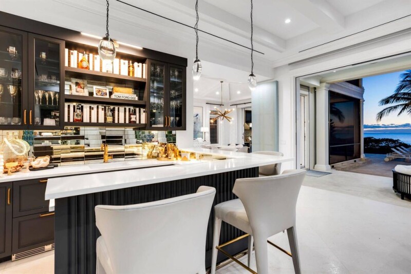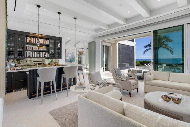 Stunning gated West Indies-inspired 2 story, 5 BD, 5.4 BA smarthouse on high elevation 1+/- acre lot w/104'+/- bulkhead seawall & breathtaking direct ocean views. Superbly crafted. Impeccably designed by Red Leaf Interiors (Nashville, TN). Offered TURNKEY - fully furnished down to the flatware. 2 primary suites, office/den, chef's kitchen, butler's pantry, elevator, 2 fireplaces, 4-bay side-load garage, 5 HVAC, H20 filtration, screened lanai, heated pool/spa, summer kitchen, putting green. Cabana w/guest suite, kitchen, office, family room. Within walking distance to Private Moorings Yacht & Country Club golf, tennis and dining. Intracoastal yacht slips available.