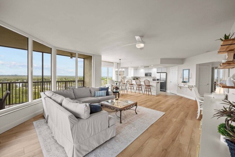 Luxury living meets breathtaking 180-degree views of the Gulf from this spacious seventh-floor end unit in Serano. The exceptional floor plan includes over 2,100 square feet with three bedrooms, 3.5 baths and a private, secure elevator entrance. Enjoy this spacious split bedroom, coastal plan with designer wood flooring throughout the living areas. Stainless appliances and breakfast-bar provide ample counter space and an ideal complement to the open-concept living area with panoramic views. The two guest bedrooms with en-suite baths are ideal for family and visitors alike. The large primary bedroom includes more beautiful western views with a hint of Marco Island. A large walk-in closet, two separate sinks, vanity, stand-alone shower with custom tile and resort-style bath. Serano has an exquisite lobby with interior amenities including a social room including bar, pool table, TV, a nicely equipped fitness center and movie theater. Enjoy the outdoor barbecue area, cabaña poolside along with a hot tub. Just minutes away to Marco Island beaches, 5th Avenue shopping, golf and more.