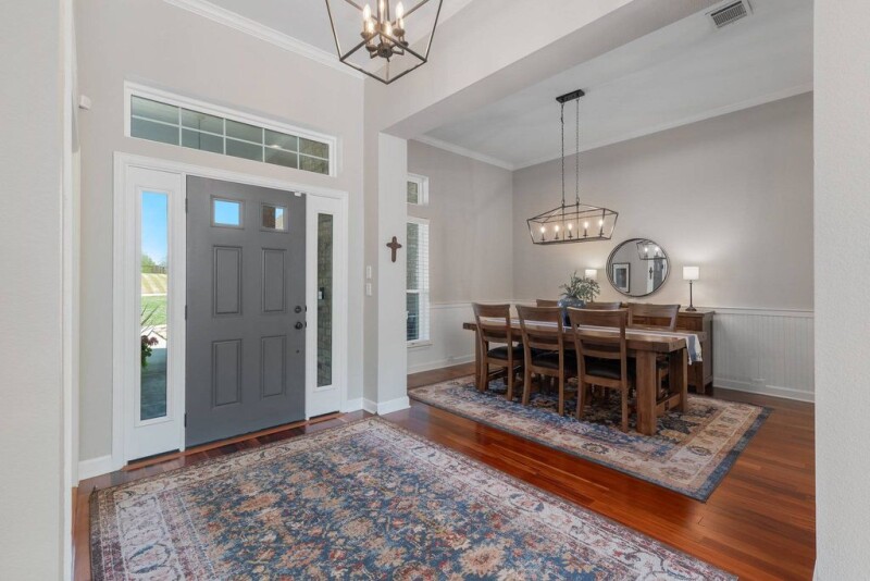 Nestled on an expansive acre plus lot, this charming 1.5 story brick home offers a serene retreat in a peaceful suburban community. Surrounded by lush landscaping, the property provides a picturesque view of the nearby greenbelt and is just a stone's throw away from a tranquil lake, perfect for leisurely strolls or picnics. As you approach the home, you'll be greeted by a beautifully maintained exterior that complements its natural surroundings. Inside, the warmth of wood floors flows throughout the entire home including all bedrooms and office, enhance its inviting ambiance complete with a cozy fireplace with an elevated stone hearth perfect for curling up and enjoying your favorite book or beverage. Upscale trim, elegant molding, and custom finishes adorn each room, showcasing attention to detail and design. The open-concept layout seamlessly connects the family, dining, and breakfast rooms, creating an ideal space for family gatherings centered around an updated kitchen showcasing granite countertops, painted cabinets, and upscale appliances. Upstairs features a large flex space perfect for entertaining with a separate full bath. Large windows and soaring ceilings offer an abundance of natural light, enhancing the home's airy feel. Step outside to discover a backyard oasis featuring a stunning diving pool and spa that beckon for relaxation on warm sunny days. The outdoor pergola provides a shaded spot for alfresco dining or reading a book while enjoying the gentle breeze in just one of several lounging areas. With ample space for gardening, playing, or simply unwinding, the grounds are a true outdoor sanctuary. Conveniently located near a lake with walking trails, clubhouse, outdoor activities, medical centers, shopping, and schools, this home effortlessly balances tranquility with accessibility and amenities. Experience the best of suburban living in this idyllic setting!.