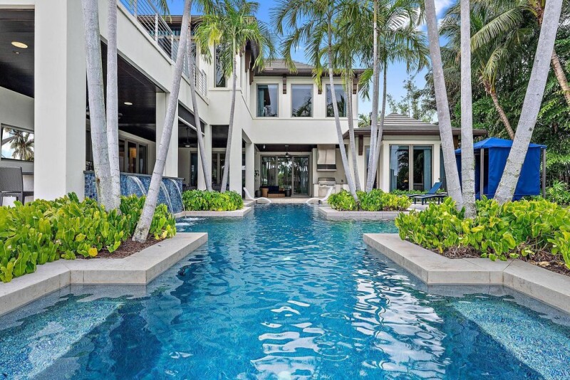 Welcome to 177 Commodore Drive located in the prestigious Admirals Cove located in Jupiter, FL. This custom-designed masterpiece boasts 120' of water frontage, offering 5 bedrooms + office/den and unrivaled luxury. A resort-style pool, spa, and lounge areas create a vacation-like ambiance upon entry. Covered/open loggias w/ Pecky Cypress, TVs, and a 2-sided pop-up TV elevate outdoor living. The chef's kitchen features dual islands, gas range, & top-tier appliances, overlooking the family & breakfast areas. The owner's retreat stuns with a fireplace, blackout shades, spa bath, & walk-in closets. A private guest suite downstairs & 3 upper suites open to a loft with a beverage station. The library leads to a waterfront balcony. Dock w/lift, jet ski platforms, putting green, & more!.