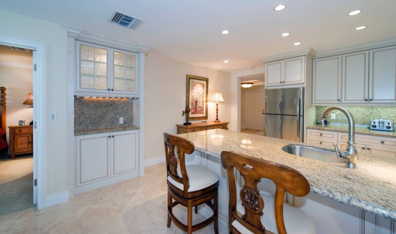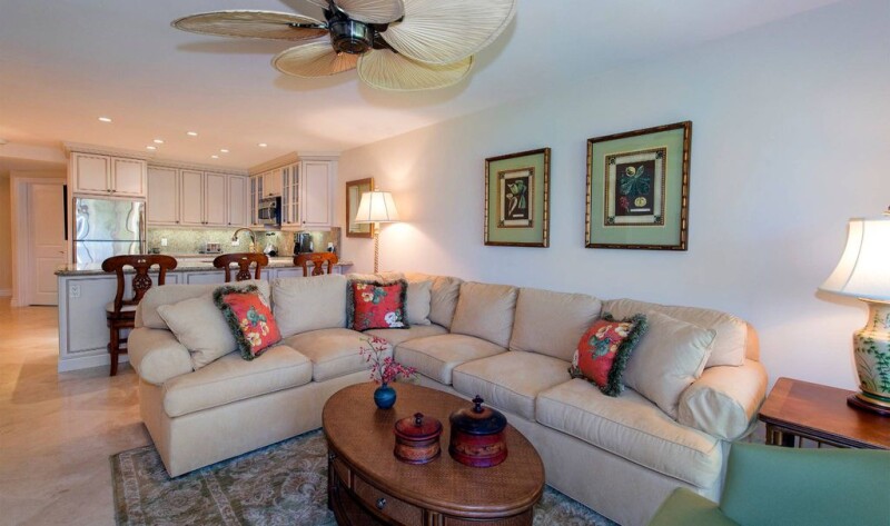 Great Location! New exterior renovations to begin this summer including a covered terrace off the master and living room areas! Currently, the main living area has an enlarged living room with tropical views out to the ocean and gourmet kitchen with custom cabinetry and granite counters. The master bedroom offers ocean views and an enlarged bath with double vanities and gracious walk-in shower. Complete with golf cart garage storage and boat dockage to accommodate up to a 40 ft. boat. This condominium is in a great location within walking distance to the Club facilities and beach.