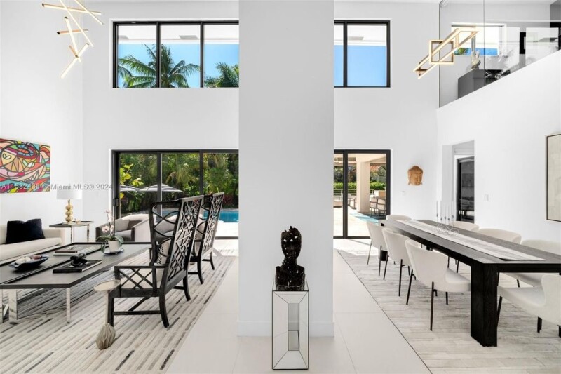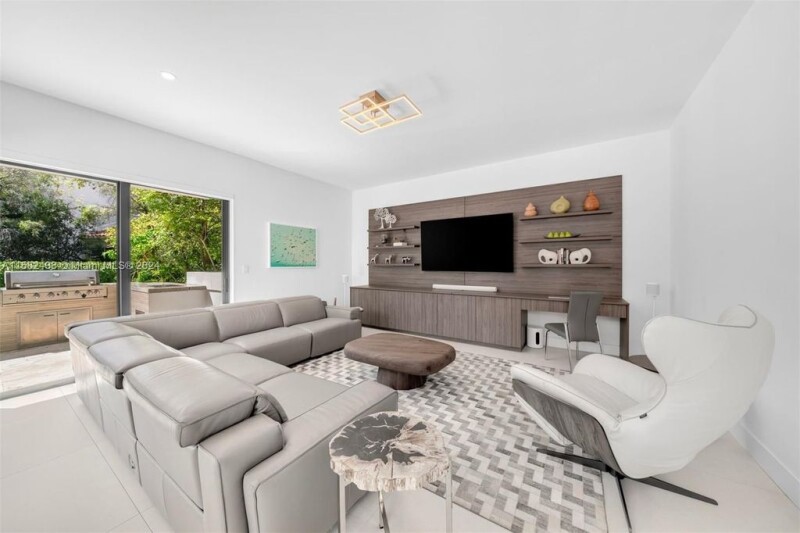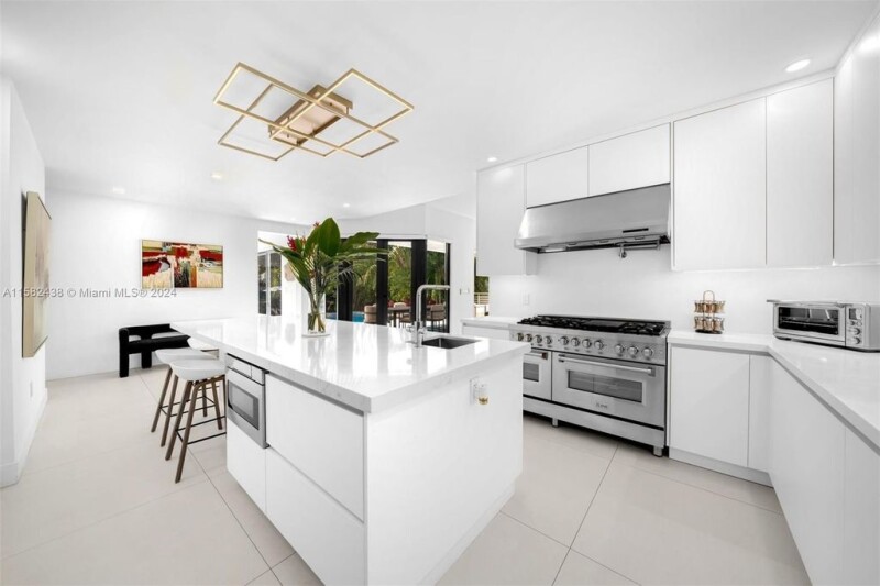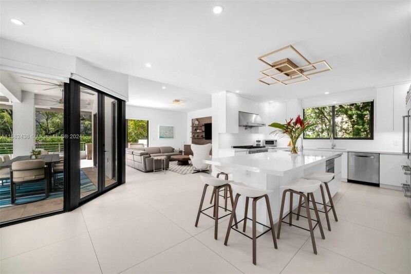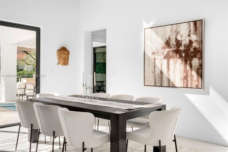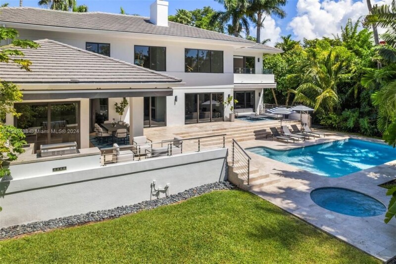 Contemporary 6,760 SF residence with 5 BD and 5.5 BA on a sizable 18,055 SF lot, in the highly sought-after gated community of Cocoplum. Substantially remodeled in 2021, the two-story home showcases voluminous ceilings and an open layout offering plenty of natural light. The gourmet eat-in kitchen features custom floor-to-ceiling cabinetry, ample storage, gas range, high-end appliances, and Grohe carbonated water filter system. The kitchen and family room open seamlessly to outdoor entertainment areas and a beautiful backyard, including a pool with jacuzzi, terraces with retractable awnings, summer kitchen, and stunning tropical landscaping. Additional features include impact windows and doors, office with glass enclosure, media room, and 2-car garage with epoxy flooring.