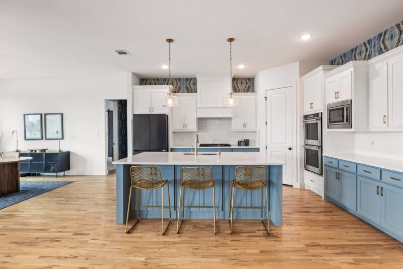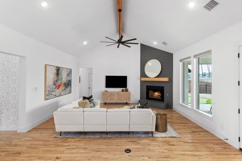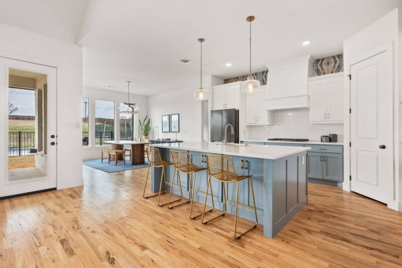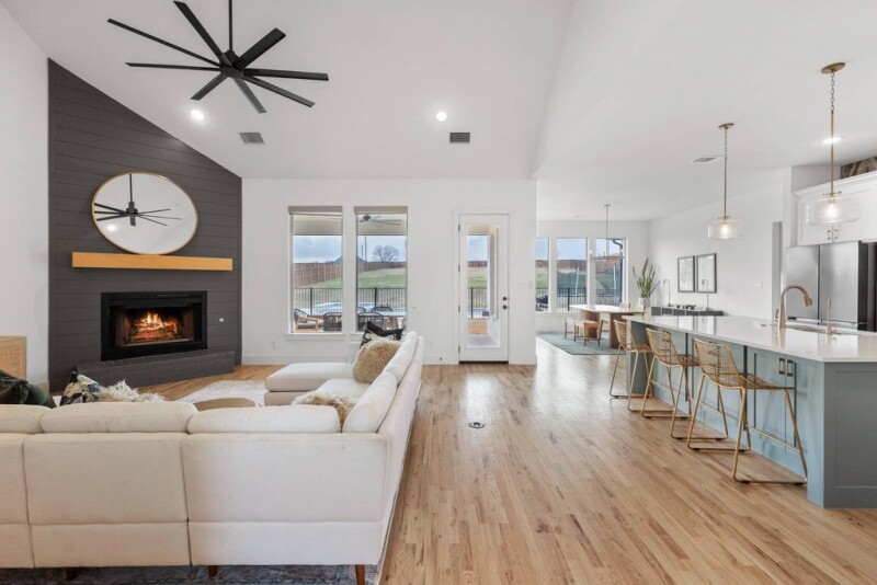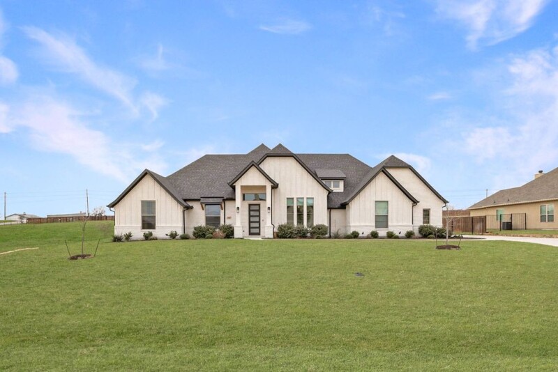 Nestled in a highly sought-after gated neighborhood, this exceptional home seamlessly blends style, comfort, and functionality. Boasting an open floor plan, the residence features beautifully designed wallpaper, elegant lighting, and stunning tilework that flow throughout the space. A tasteful mix of metal fixtures and hardware complements the modern aesthetic, while designer interior lighting adds a touch of sophistication. The gourmet kitchen is a true centerpiece, equipped with top-of-the-line Kitchen Aid appliances, abundant counter space, and ample cabinetry for all your culinary needs. High ceilings and large windows fill the home with an abundance of natural light, enhancing the airy, welcoming atmosphere. The hand-scraped hardwood floors exude timeless charm, complemented by upgraded carpets that add warmth and comfort to the living spaces. The spacious laundry room is thoughtfully designed with appliance cabinets and a convenient sink, while the mudroom offers built-in shelves and drawers to help keep everything organized. The master closet is a dream, featuring a custom fur or formal rack to neatly store your wardrobe. Step outside to enjoy the expansive backyard, perfect for entertaining or simply relaxing. A large back porch overlooks a sparkling swimming pool, complete with a hot tub, tanning ledge, and built-in bar stools for ultimate luxury. A 3-hole putting green adds a fun touch to the outdoor space, while the wood privacy fence and wrought iron pool fence ensure safety and seclusion. Additional highlights include a 3-car garage with a workbench and built-in cabinetry, designer exterior lighting, and a water softener. With greenspace next to the lot, you'll have quiet evenings with views of breathtaking Texas sunsets. Best of all, there are no city taxes, making this the perfect retreat for those seeking privacy, convenience, and a peaceful lifestyle.
