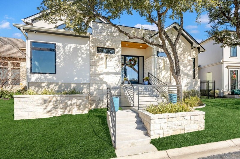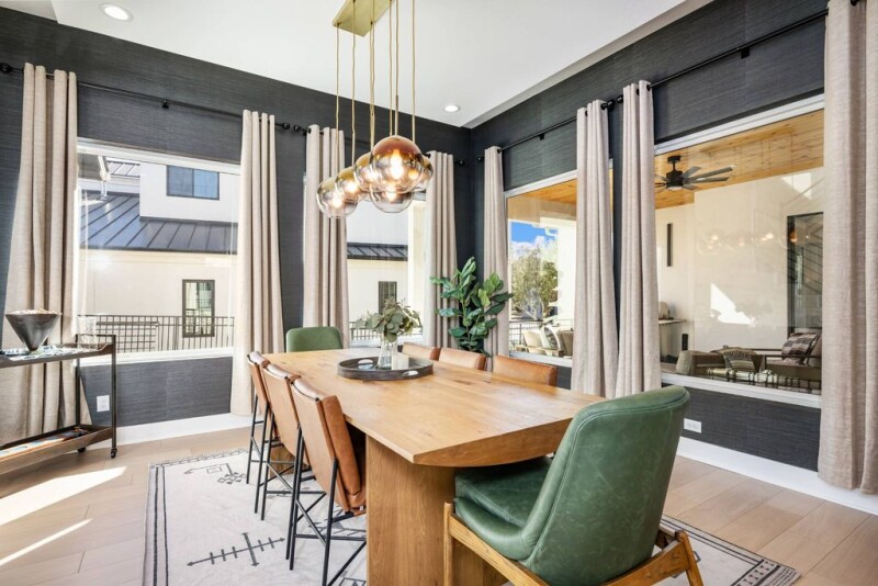 Contemporary design elements found within this stunning home, bathed in natural light, exemplify modern luxury and exquisite craftsmanship. A striking pivot-style metal and glass front door opens to an inviting open floor plan, designed for seamless living and filled with light. The home boasts soaring 17-foot vaulted ceilings in the main living area, complemented by a sleek glass-wall fireplace, creating a spacious and airy ambiance. The chef's kitchen, outfitted with premium Fulgar Milano appliances, features a generous eat-in waterfall island, a butler's pantry with a full-size wine and coffee bar, and a large walk-in pantry. The first floor also includes a dining area, an office with barn doors, a guest bedroom with an en-suite bathroom, and a luxurious primary suite with a spa-like bathroom. A floating staircase leads to the second floor, which offers a spacious game room and two large bedrooms with ample closets. Sliding glass doors on the main level seamlessly blend indoor and outdoor living, leading to a serene backyard retreat highlighted by an oversized covered patio with elegant wood-paneled ceiling accents-perfect for entertaining or relaxing. This home effortlessly combines functionality with timeless design.