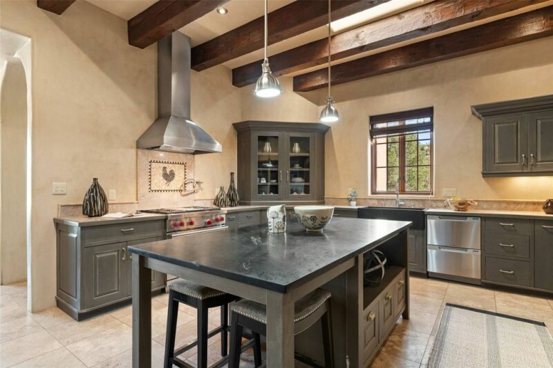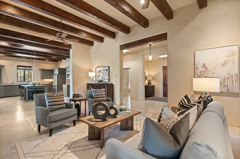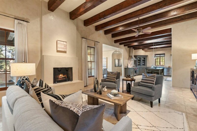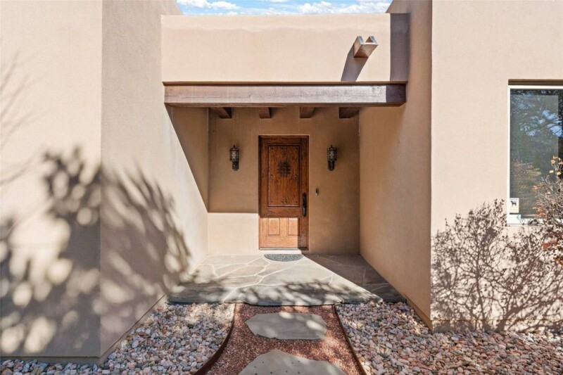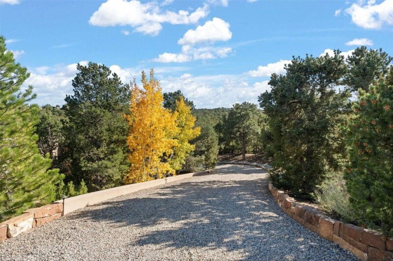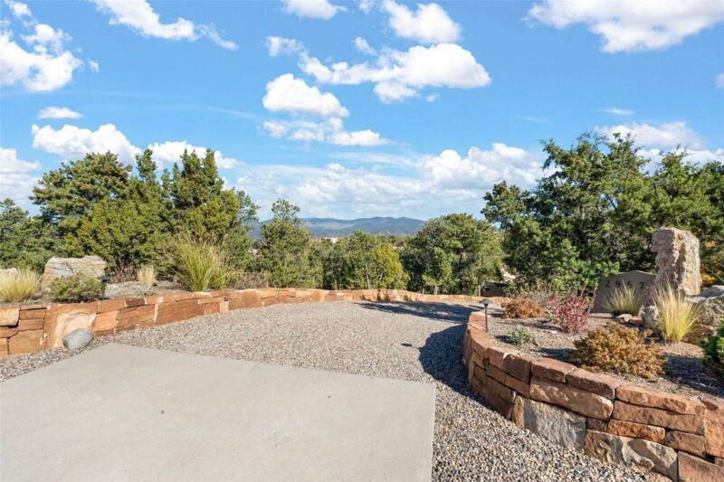 Nestled into one of Monte Sereno’s quietest streets—Broken Sherd—this Mediterranean influenced gem features one level living, with great views of the Sangre De Cristo Mountains. This wonderful site is filled with old growth Pinon trees. With travertine floors, plaster walls, and richly colored wooden beams in the public spaces and primary Suite, this home will delight those looking for great value in one of the most desirable neighborhoods in Santa Fe. The gorgeous kitchen is open to the living room and dining area, and features custom cabinets, stainless steel appliances, stone counter tops, and a walk-in pantry. Enjoy outdoor dining beneath the deep covered portal, and a walled courtyard with mature trees and mountain views. The primary suite is well appointed with high beamed ceilings, a romantic fireplace, and a sumptuous bath with a deep soaking tub, separate shower, and stone sink basins. The oversized two-car garage has an enormous storage room, or hobby space. The adjoining buildable lot is offered for sale separately, with the purchase of the home, for a compelling price of $149,000.