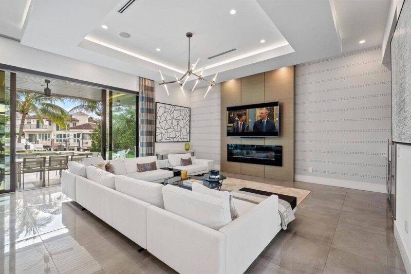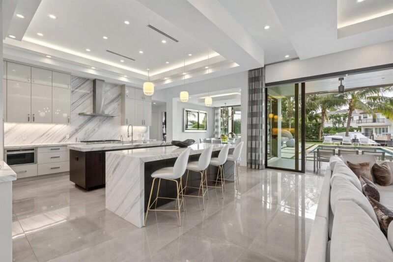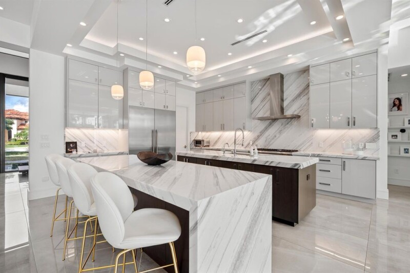 Epitomizing modern elegance, this stunning, five-bedroom masterpiece, built in 2019, meticulously maintained, and boasting 7,868 +/- total square feet, offers the ultimate in luxury coastal living. Making a breathtaking first impression immediately upon entry, the dramatic two-story foyer, with a freeform stairway and glass-encased elevator, introduces the open-concept-design living areas where window-walls of sliding glass doors open to loggias overlooking views of the resort-style backyard and scenic waterway. The living and dining rooms integrate seamlessly with the gourmet dual-island kitchen, a culinary haven fitted with contemporary, grey-lacquered cabinetry; Thermador stainless appliances; marble counters and backsplashes; and large walk-in pantry.