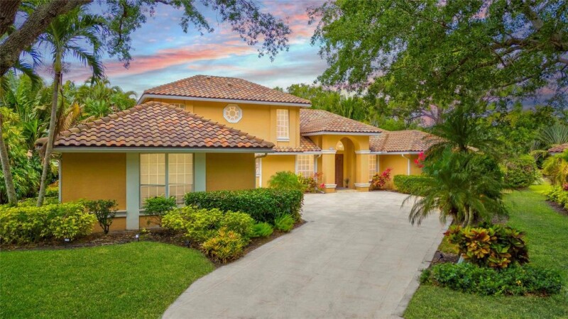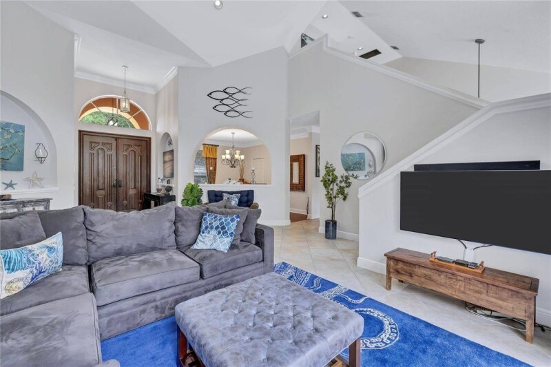 Discover comfort and luxury in this stunning 2-story home, tucked inside a private gated community at the end of a quiet cul-de-sac. Set on over 16,000 sq ft, this 3,600+ sq ft home offers high ceilings, tons of natural light, and peaceful lake views. Enjoy a cozy living room with fireplace and built-in bar, plus a chef’s kitchen with custom wood cabinets, granite counters, and a walk-in pantry. The first-floor primary suite features tray ceilings, dual closets, a spa-like bath, soaking tub, and walk-in shower. Entertain outdoors with a screened kitchen, saltwater pool, and spa. Includes 3-car garage, 2023 AC, and 2015 barrel tile roof. Stay friendly.