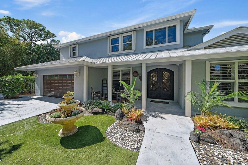 Discover a secluded paradise with tropical charm in the heart of Jupiter. Your peaceful oasis awaits you in this stunning Concrete Block 5 bedroom 4.5 bath home thoughtfully positioned in a peaceful 3 home cul de sac. Tremendous curb appeal instantly grabs your attention as you approach a long winding driveway surrounded by 3 majestic oak trees, swaying 25' bamboo and lush landscaping. The heart of the house features a wide open floorplan with views to the resort style backyard from almost every area of the main level. A renovated kitchen (2017) featuring a large built-in side by side column refrigerator/freezer, 5 burner gas stove, 2 sinks, 8 foot island and separate peninsula with plenty of counter space and storage. The wide open space includes several areas to create and decorate to.