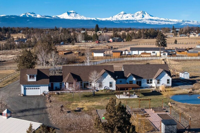 Enjoy breathtaking mountain views and endless possibilities at this remarkable property! Designed for versatility, the home functions as a spacious single residence or a multi-generational setup with a separate 1,625 sq. ft. guest quarters (included in the total living space), which can be locked off from the main house. The main level provides convenient living, with a bonus room upstairs and a separate access area perfect for an office, guest suite, or hobby space. The guest quarters feature a great room, primary bedroom, office, two baths, dining/kitchen area, and a private patio. Enjoy 11 acres of flood irrigation, a fenced orchard, garden area, and two serene ponds. The property includes a 44x48 six-stall barn with a heated tack room and upstairs storage, a 1,748 sq. ft. insulated 3-bay shop with a pellet stove, and a charming chicken coop. Ideally located between Bend and Redmond, this property offers unmatched potential for a dream lifestyle.