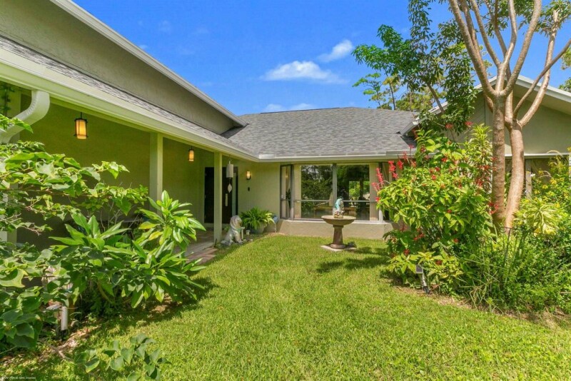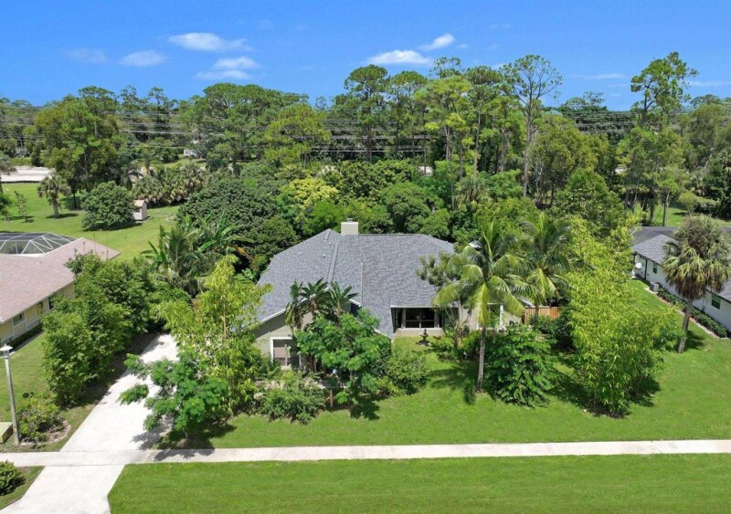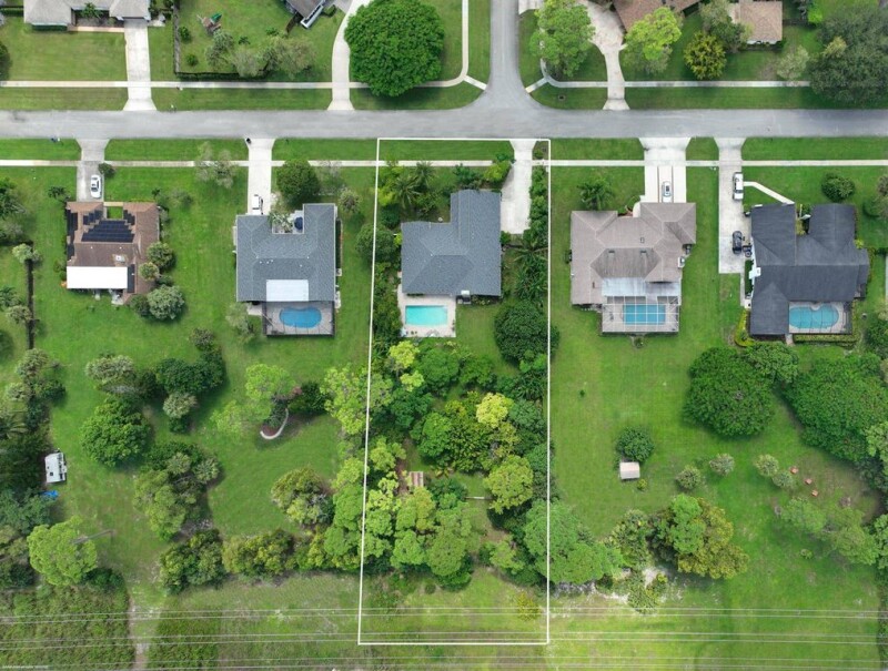 Just under one acre in the gorgeous wooded Wellington neighborhood of Pinewood East 2! Spread out and relax on this lush large lot that includes a 2500 sq ft home with a new roof, large pool deck with a salt water pool, huge yard, tree house and more. The ranch style home features 4 bedrooms, 3 full bathrooms, formal living room with a large bay window, formal dining room, and a large family room with a coral stone fireplace and picture windows. The kitchen is open to the living space and has bar seating plus an adjacent breakfast area. Just outside the French doors is a large fully covered and screened-in lanai overlooking the gorgeous pool area and garden of exotic fruit trees. The garage has been converted into a finished space with central ac, perfect for an office or bonus room!.