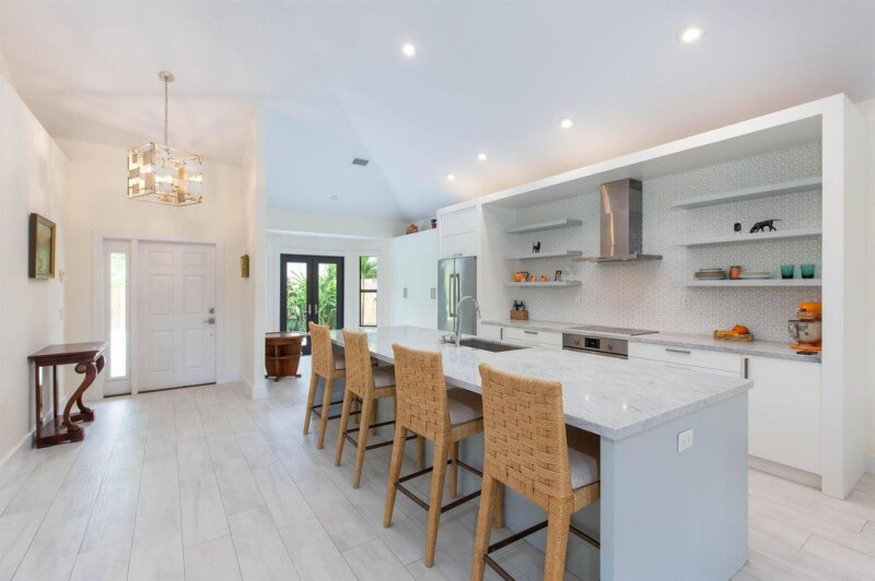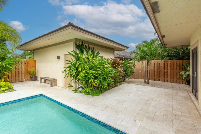 This beautifully updated bungalow offers a combination of comfort, style, and functionality. With 2 bed/ 2 bath and garage, this property is ideal for anyone seeking a serene retreat in the Palm Beach Polo community.The home features a fully renovated interior with high-end finishes, including a designer kitchen with a marble center island, floating shelves, and a custom inlaid backsplash.Enjoy the peaceful back terrace with water views, now newly screened for outdoor dining and relaxation. The East side of the home is lined with 8-foot impact sliders, allowing for plenty of natural light and easy access to the outdoors.A newly installed pool in the front courtyard faces west, offering a great spot to unwind and take in Florida's beautiful sunsets.