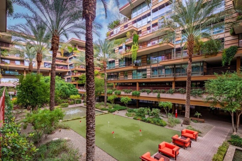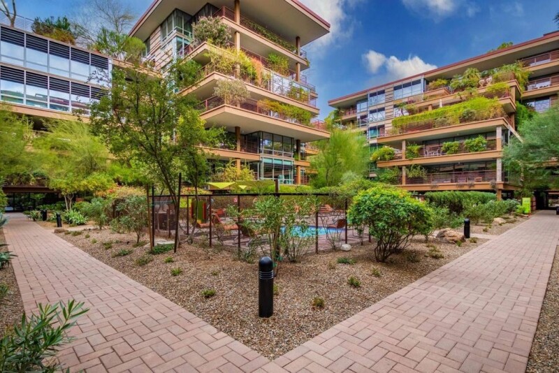 Frank Lloyd Wright-Inspired Apartment Style Home Ready For Your Personal Touch. This is your opportunity to create your dream space within an extraordinary building. Combining sustainable materials and modernist design, this mid-rise unit is a masterpiece in its own right. Situated on the 4th floor, this 3-bedroom, 2-bathroom loft spans 1687sq' of open-concept living space. With an abundance of natural light, the space feels expansive, airy, and full of potential. Original hardwood floors and floor-to-ceiling windows are just a few of the timeless architectural elements waiting to be reimagined. The layout is as versatile as it is striking. The open living and dining areas provide an ideal canvas for indoor/outdoor entertaining. Prime location within the building featuring unobstructed breathtaking Southeast city & mountain views from your private patio. From this vantage point, you'll enjoy a blend of Old Town Scottsdale skyline and spectacular Sonoran mountain sunrises! The patio is the perfect space for morning coffee, evening relaxation, or hosting guests, offering a tranquil retreat that feels far removed from the hustle and bustle of city life. Community includes: 2 heated outdoor Zen pools, spas & bbq's. Remodeled 24,000 sq. ft. state of the art fitness center, locker rooms w/steam rooms, showers & private lockers. Indoor heated lap pool, 2 spas, on-site concierge, putting green, basketball/pickleball court, racquet ball court. On-site restaurant (Metropolis), conference room, 24/7 security, party room and flex space/yoga room. Professional photos of interior will be available Thursday 1/16/2025!.