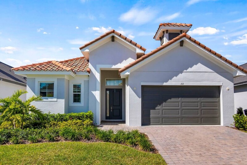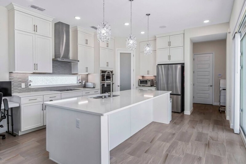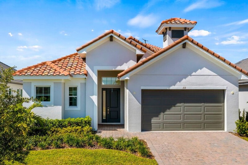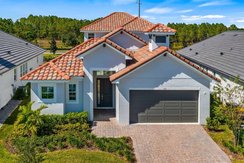 Welcome to 212 Hampton Loop, a four-bedroom, 3.5-bath pool home in the gated community of Providence, Davenport. This home, lived in for only a few months, features newly installed security cameras, outdoor lighting in the front and back, and Wi-Fi-enabled light switches. These upgrades enhance convenience, security, and energy efficiency. Upon entry, you're welcomed into a spacious gathering room with vaulted ceilings that enhance the openness and natural light. This central area is ideal for family time or entertaining guests. The kitchen is equipped with stainless steel appliances, a large center island, and plenty of counter space. A walk-in pantry and open layout make it practical for both daily meals and hosting gatherings. Custom cabinetry and modern fixtures add to its appeal. The owner's suite overlooks the private courtyard pool, offering direct access to a patio. The en-suite bath includes dual vanities, a soaking tub, and high-end finishes for a spa-like experience. Additional highlights include a two-car garage with extra storage, a large great room, and a dining area with high ceilings and natural light. The private courtyard pool is surrounded by landscaping, providing a relaxing retreat. The backyard, with no rear neighbors, offers added privacy. Residents enjoy access to community amenities, including a pool, fitness center, and clubhouse. The 24/7 guarded and gated entrance ensures security and peace of mind.