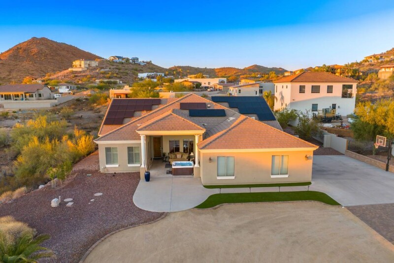 Just see this well-appointed executive home featuring 4 bedrooms, 4 bathrooms, bonus exercise room/office, an oversized 3 car garage, fenced and heated pool, hot tub, large artificial turf lawn, and OWNED solar panels! Huge primary suite with separate his and hers closets, separate dual height vanities, double shower and a luxurious spa tub. This home has everything you've been looking for in one of the best locations in the neighborhood - gorgeous mountain and city views, paved roads, no HOA, and buried power lines. Plenty of room for your toys.
