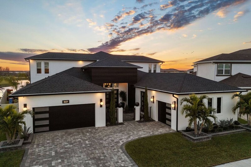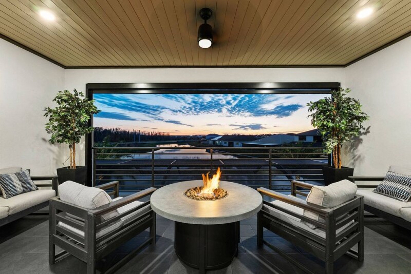 Exceptional luxury residence in the desired Robin's Cove of Epperson Lagoon community offering unparalleled interior finishes complimented by stunning outdoor living spaces. This waterfront home offers an attractive floor plan with five stunning bedrooms, four full baths, a powder room, executive office, home gym, flex room, upstairs media room, scenic balcony and a dream pool area with an outdoor kitchen. The home opens into a welcoming foyer with soaring 14-foot ceilings, with direct water views, setting the stage for the elegance within. The great room is fitted with an outstanding feature wall of large format tile, rustic wood and modern cladding, while complimenting the lighted ceiling trim and centered around an oversized sectional. The gourmet kitchen boasts an extended island with beautiful countertops highlighting dual waterfall edges, glass display cabinets, elite appliances including a built-in cooktop and range hood, dual built-in convection ovens and a stainless-steel farmhouse sink. The adjacent dinette features a wood feature wall with built-in decorative shelving and an oversized rear-facing window. The primary bedroom suite is generously sized and offers a tranquil retreat with a contrasting décor wall with built-in electric fireplace, and an oversized window. The primary bath oasis features a frameless glass walk-in shower with black river rock tile flooring and a rainfall showerhead, a freestanding tub, a large window with a privacy shade, a spacious vanity with two sinks, and access to separate built out closets. Upstairs, a versatile loft space awaits with another statement wall design for a theater-like experience, but cozy and relaxing with the modern fireplace completing the ambiance. Upstairs amenities of a built-in wet bar, beverage refrigerator, double-burner cooktop for fresh popcorn and screened rear-facing balcony. Outstanding features adding architectural details include crown molding throughout, pendant accents, chair rail, picture box trim, luxury wallpaper accents and oversized baseboards. Other practical enhancements include tinted windows and motorized shades, built out mudroom and drop zone, and dual-zoned air conditioning. Large sliding doors provide an unbroken transition to the outdoor escape, where a heated saltwater pool with dual waterfalls, a tanning ledge and seamless panoramic screen enclosure await. The built-in and covered stone outdoor kitchen is complete with a grill, hood vent, sink, beverage refrigerator, bar seating and wood panel ceilings. All of this on a wide lot, with fenced side yards, and a sprawling paver driveway providing easy access to the split three-car garage and gated front entrance. Epperson's famous crystal lagoon comprises 7.5 acres of clear blue water including sandy beaches, swim-up bar, food trucks and water activities. Epperson also showcases UltraFi, a community wide internet and cable experience, Streetleaf solar streetlights, golf cart paths and miles of trails. In the Robin's Cove neighborhood is Eagle Park which includes a community clubhouse, recreational trails, exercise stations, dog parks, playground and a dock for King Lake. This growing area is across the street from The Kirkland Ranch Academy of Innovation and new Kirkland Ranch K-8 School.