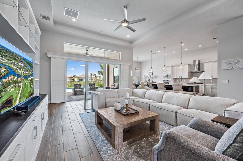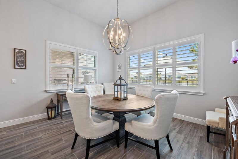 Welcome to 9985 Timber Creek Way, where you can live your best life now in an incredible home upgraded beyond the models with tremendous builder enhancements and extensive post-closing renovations. Located in the exclusive Regency at Avenir, a gated 55+ community, this 3-bedroom, 3-bath home is a rare opportunity to own a fully customized, move-in-ready retreat.Luxury starts at the custom full-length double glass entry doors and continues inside with California Custom Closets in all bedrooms, built-in lighted cabinetry, whole-home plantation shutters, designer lighting, and remote-controlled ceiling fans. The garage is upgraded with a polyaspartic floor, ultra-quiet Chamberlain opener with a camera, and an outdoor keypad.