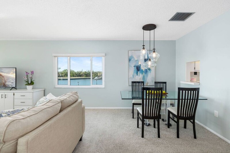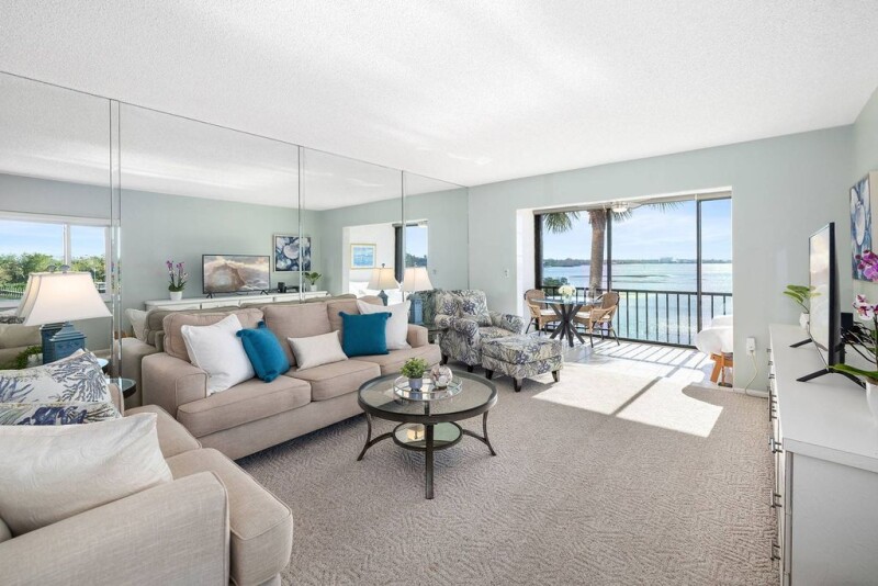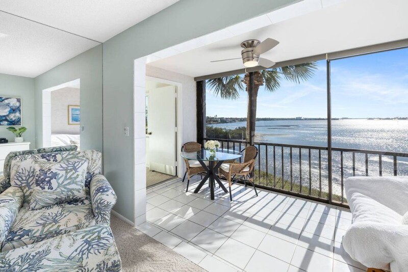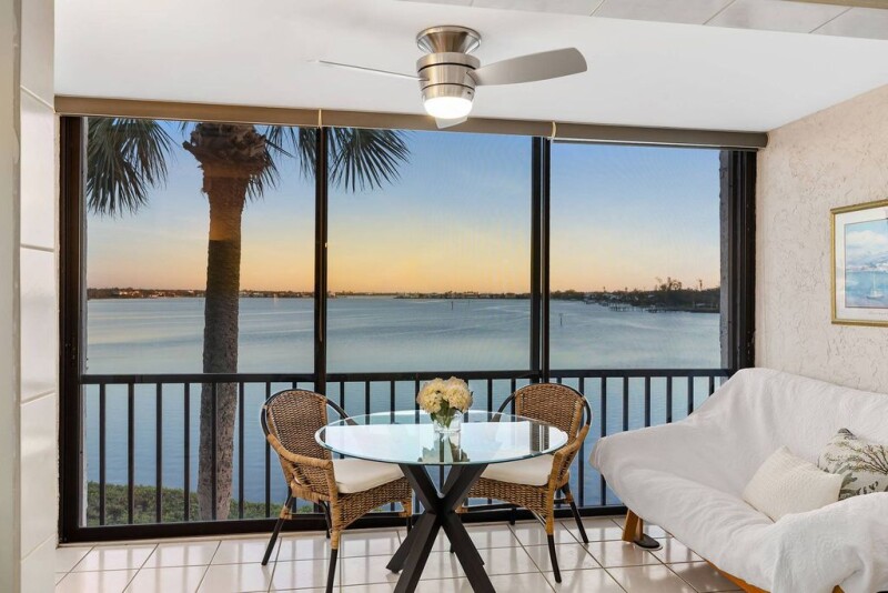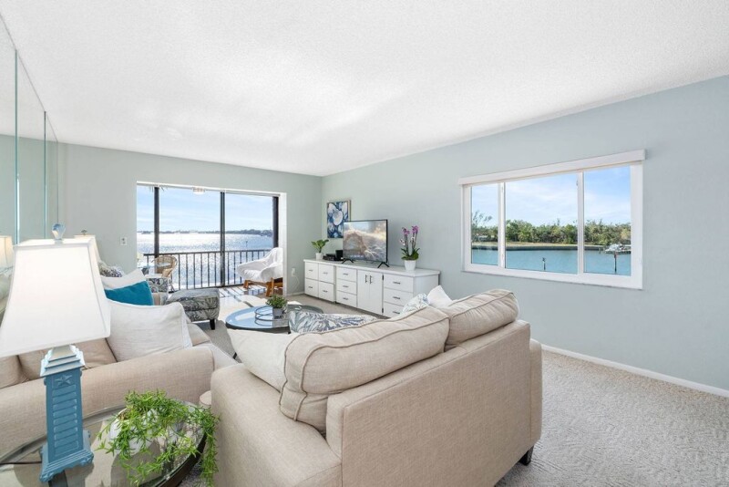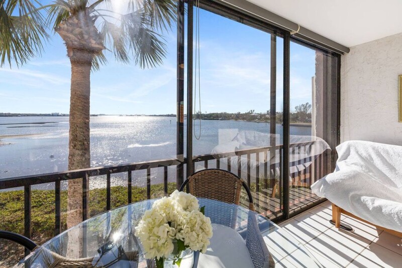 Relaxing on the balcony of this Sarasota waterfront residence makes you feel as if you're floating on water. Enjoy breathtaking panoramic water views as boats pass by, dolphins play and sunsets light up the sky. This cozy, bright and cheery condo is located at the gateway to world-famous Siesta Key in Sarasota, Florida. This third-floor end-unit is unique in that it has a coveted, west-facing, oversize window with full views of the Intracoastal Waterway. Coastal living is super convenient with the beach, marina, boat rentals, watersport excursions, fishing charters, and a wide variety of shops and restaurants within walking distance. The floorplan features a great room, kitchen, two bedrooms, two baths and a Florida room with fabulous water views. A cool coastal palette complements the beachy ambiance of this sun-and-fun residence. Castel del Mare is an 8-acre bayfront community with two swimming pools, one tennis court with two pickleball courts, fishing pier, kayak storage, clubhouse and fishing pier. The location can't be beat -- on the mainland with easy access to all that Sarasota has to offer combined with the charm and grace of waterfront living. Here is the place to settle in, have fun and relax.