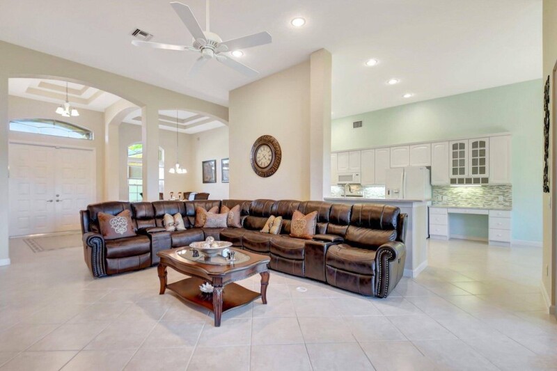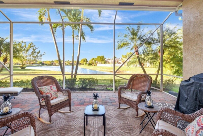 Nestled on a rare 1/3-acre lakeside lot in the prestigious Estates section of Baywinds, this stunning builder's model showcases mesmerizing lake views from its expanded enclosed lanai and every front-facing room. This refined 3-bedroom, 3-bath residence exudes warmth with its light, neutral palette throughout. The generous living room, featuring double sliders to the lanai, flows effortlessly into a formal dining area accented by a stylish tray ceiling. The open layout leads to a modernized kitchen, complete with a charming breakfast nook, 42'' cabinets, quartzite counters, a two-tier breakfast bar, a spacious pantry, and a chef's island. Adjacent, the cafe area offers seamless lanai access.The master suite is a tranquil haven, boasting a private family room, a dedicated dressing space.
