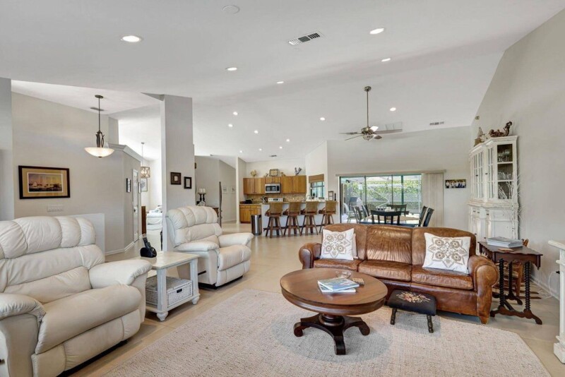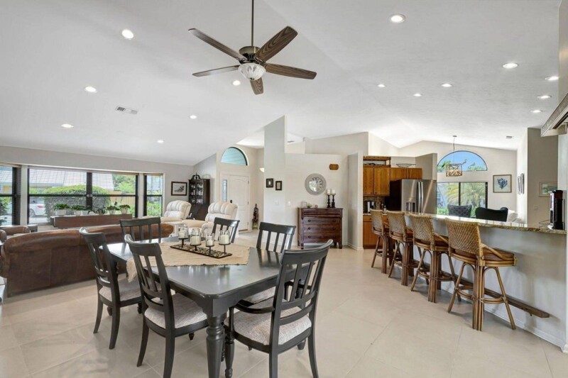 This Key West style single-family residence features four bedrooms and two bathrooms, highlighted by a generous master suite overlooking the private pool. The expansive living and dining area offers ample space for relaxation and entertaining, seamlessly connected to an open kitchen and family room. The split floor plan ensures privacy, with the remaining bedrooms recently updated with fresh flooring. A modernized laundry room, conveniently located adjacent to the two-car garage, adds to the home's functionality. Outside, large sliding doors lead to a screened-in patio and pool area, creating an inviting outdoor living space complemented by an outdoor shower.Recent upgrades to this property include a new AC system installed in 2022, impact windows for enhanced safety and energy.