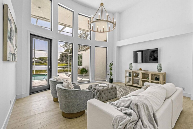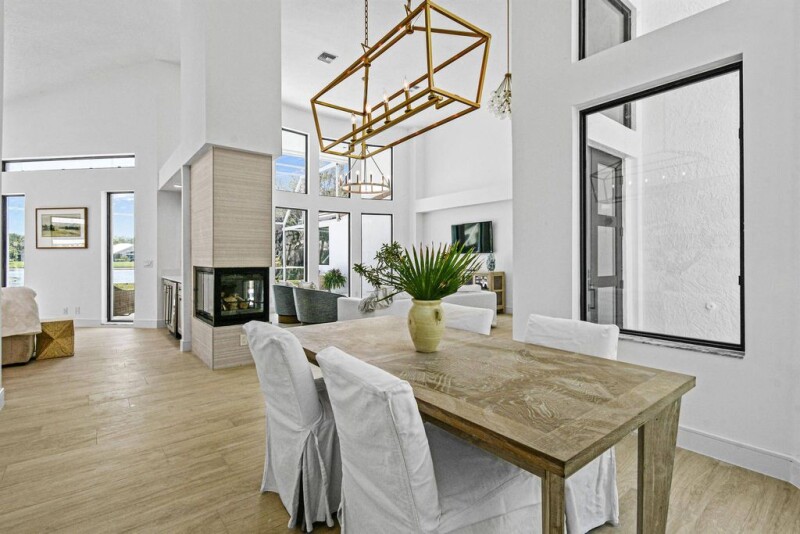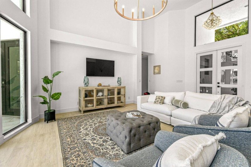 Welcome to this FULLY RENOVATED Shores home with amazing southern exposure lake views as soon as you enter the front door. You will have peace of mind with ALL PGT IMPACT WINDOWS AND DOORS with energy shield max impact for enhanced energy efficiency. The kitchen has shaker wood soft close cabinets and drawers, an oversized island with quartz countertops and backsplash with a double waterfall edge, a custom hood, GE stainless appliances, and a built in bar with a sink and wine fridge. Every interior door has been replaced with solid core shaker doors with new hardware. The spa like primary bathroom has a mosaic marble shower floor, frameless shower door, stand alone tub with a tub filler, dual vanity, and large walk in closet. You will love the high ceilings, wood burning fireplace, wide.