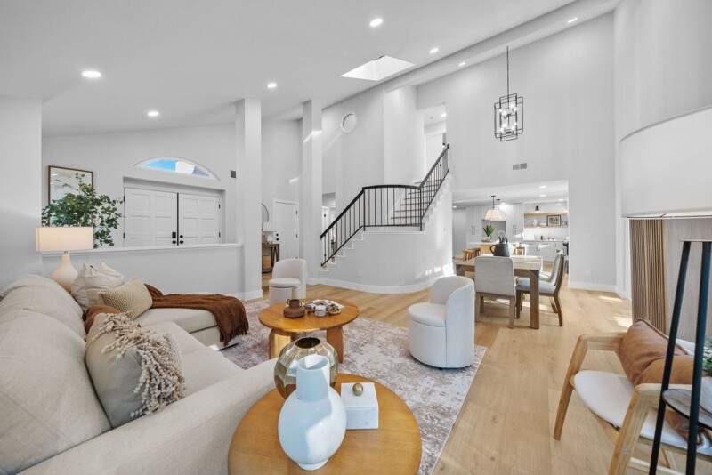 Step into this beautifully remodeled Scripps Ranch home, where every detail has been thoughtfully designed to offer both style and comfort. Nestled on a quiet cul-de-sac, this 4-bedroom, 2.5-bathroom beauty immediately welcomes you with soaring ceilings and rich oak-toned flooring that stretches across the open-concept living space, creating a seamless flow throughout. As you move through the living room, the space naturally leads to the dining area and kitchen, which are perfect for both everyday living and hosting friends and family. This chef-inspired kitchen is a true highlight, with clean white shaker cabinets, gleaming quartz countertops, and floating shelves offering both style and practicality. The floor-to-ceiling backsplash adds a striking visual element, while high-end appliances ensure that meal prep is as enjoyable as it is easy. The expansive central island provides extra space for cooking or gathering, making it the heart of this space. Adjacent to the kitchen, the family room invites you to relax and unwind, with a cozy fireplace that enhances the home’s warm, welcoming atmosphere. Upstairs, the primary suite offers a peaceful retreat from the rest of the world. The spacious walk-in closet and stylish en-suite bathroom—featuring a large, modern shower with a built-in bench and niche, dual vanities with quartz counters, and designer finishes—create a spa-like experience at home. Three additional generously sized bedrooms share a beautifully appointed hall bathroom, complete with dual vanities and elegant touches that extend throughout the home. Throughout the upstairs, custom shelving, sophisticated wall paneling, and designer lighting elevate the hallway, making it feel more like an art gallery than just a passageway. Every inch of the home has been carefully considered for both functionality and beauty. Step outside, and you'll find a private, landscaped backyard that feels like a serene escape. With views of the tranquil canyon, this space invites you to relax, entertain, or simply enjoy the peaceful surroundings.
