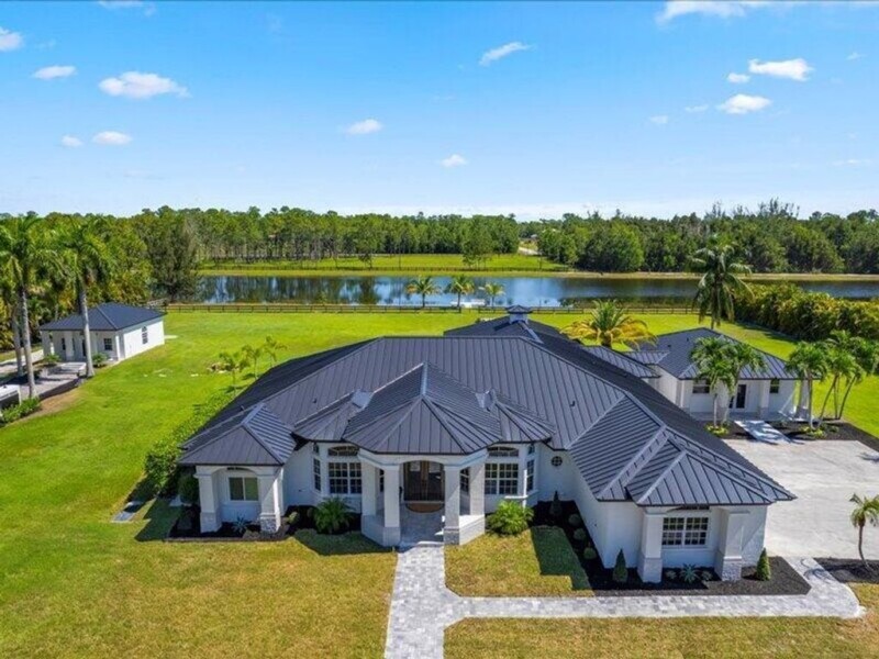 Welcome to one of the most scenic and sophisticated lakefront estate in Homeland. This immaculate 5-acre property has undergone a complete renovation, seamlessly combining traditional elements of nature with modern elegance and function. The estate features three dwellings: the main house (4 BD / 4 BA plus office, 4,264 sq. ft), a guest house (2 BD / 1 BA, 924 sq. ft), and a utility barn/garage (720 sq. ft). The beautifully landscaped grounds offer ample space for entertaining or adding equestrian features such as an arena and stable.