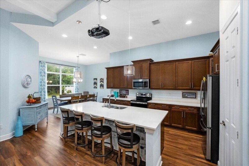 Gorgeous 2020 Custom built GHO home offering 4-beds, 3-full baths, oversized 3-car garage, POOL home & metal roof situated on a .52-acre fully fenced corner lot!! LOADED w/upgrades including impact windows & doors, large kitchen w/island starring quartz countertops w/a barnwood accent under the island, 42'' soft-close wood cabinets, top-of-the-line appliances including Bluetooth-enabled dishwasher. Upgraded lighting & ceiling fans, rounded corners, 5 1/2 base boards & 12' tray ceilings throughout w/beams in the LR ceiling. LR also offers a built-in bar w/granite tops & soft close cabinets & drawers & wine rack as well as a projector w/a pull-down screen & quadruple sliders opening to 8' (w/screens) leading to the lanai. Lanai provides a spacious covered area, bar top & a gorgeous 28 x 14.