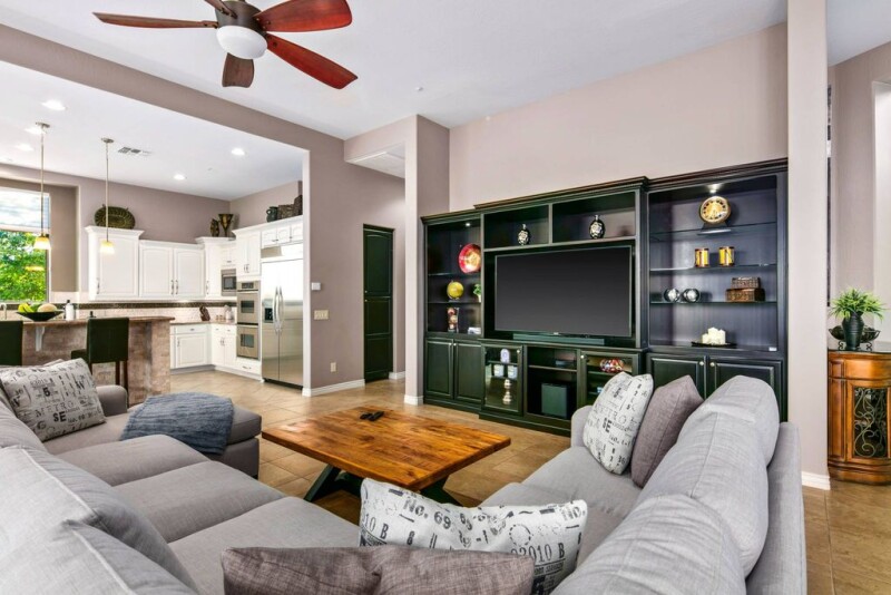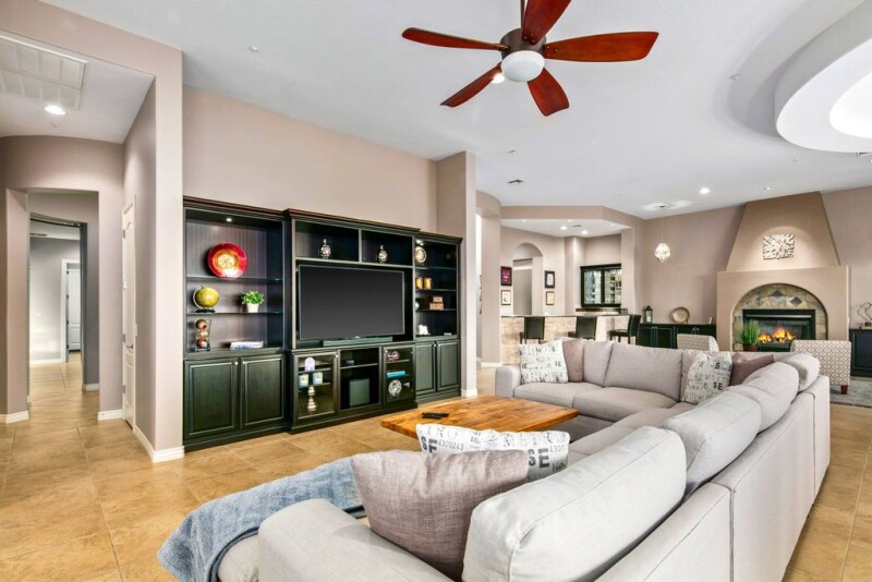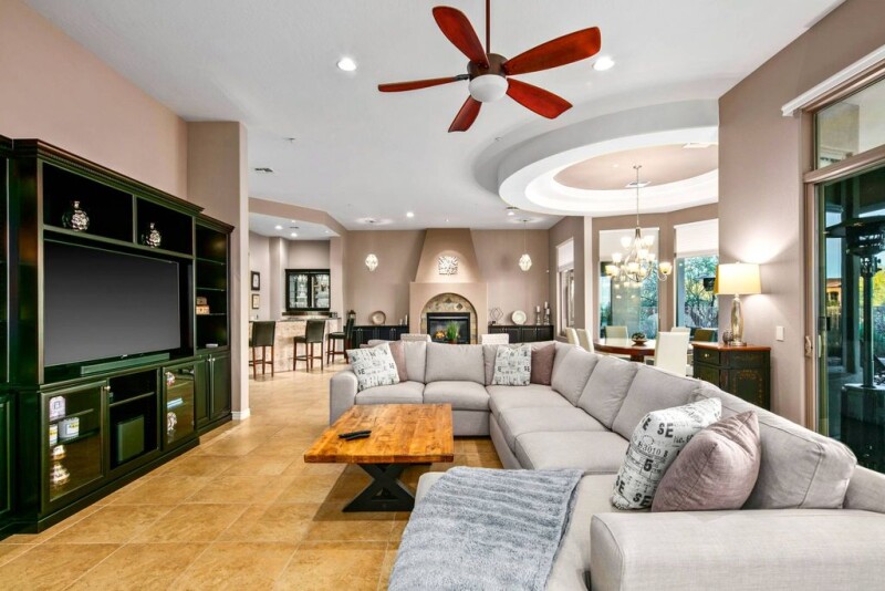 Nestled on 0.83 acres in the private, gated community of Treviso by Toll Brothers, this stunning Tuscan-style home offers a perfect blend of luxury, privacy, and breathtaking desert views. Upon entering through the impressive turret foyer, you'll be captivated by the sweeping vistas and the elegant formal dining room, setting the stage for this exceptional residence. At the heart of the home lies a gourmet kitchen, equipped with high-end Viking and KitchenAid stainless steel appliances, a tumble stone-faced island, custom backsplash, and exquisite granite countertops. The kitchen opens to a spacious family room, complete with a customized wet bar, offering the perfect space for both relaxed living and entertaining. Expansive windows in the family room overlook the lush patio and stunning desert views, seamlessly connecting the indoors and outdoors. Step outside to your private oasis, where the wraparound patio, outdoor kitchen (complete with grill, side burner, cutting board and frig), fire pit, and putting green set the stage for exceptional outdoor living. The resort-style pool and spa, featuring tranquil water features, bench seating, and boulder accents, create a serene escape with panoramic desert views. The luxurious master suite is a true retreat, offering a tray ceiling, hardwood floors, and floor-to-ceiling windows that frame the gorgeous desert landscape. The suite also includes dual walk-in closets with custom built-ins, as well as a spa-inspired en-suite bath with his and hers raised vanities, a makeup vanity, and a large walk-in shower adorned with travertine tile and multiple shower heads. This home also boasts built-in smart home technology, offering modern convenience at your fingertips. Control programmable lighting, security lights and cameras, HVAC systems, and pool equipment from the touch of a button for seamless and effortless living. Bocce and Pickle Ball are currently being added to the community recreation facility. Beyond the home itself, the exclusive Treviso community provides access to tennis courts, a ramada, and a playground, making this the perfect residence.