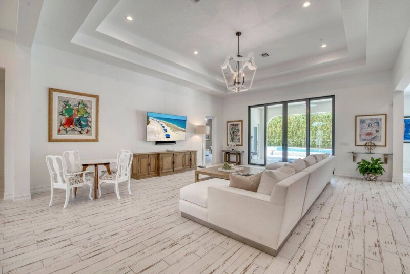 Stunning single-story home in the premier gated community of Prado. This unique home welcomes you with a towering foyer that opens to an expansive great room. The open layout draws your eyes directly to the resort pool and waterfall. The main living areas feature 12-14ft ceilings and dramatic designer lighting. Reclaimed white oak wood look tile throughout home is both beautiful and easy to maintain. The gourmet kitchen features an overside quartz island and walk-in pantry. The primary bedroom is an incredible 20 x 22 with spa bath and private direct access to lanai and pool. The resort pool features a sun shelf, spa and waterfall with defined outdoor living and dining areas. Select furnishings are available and negotiable.