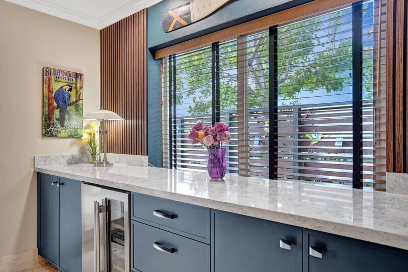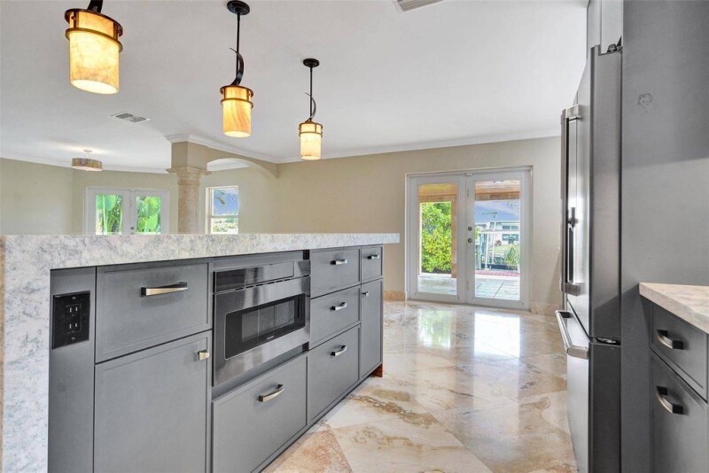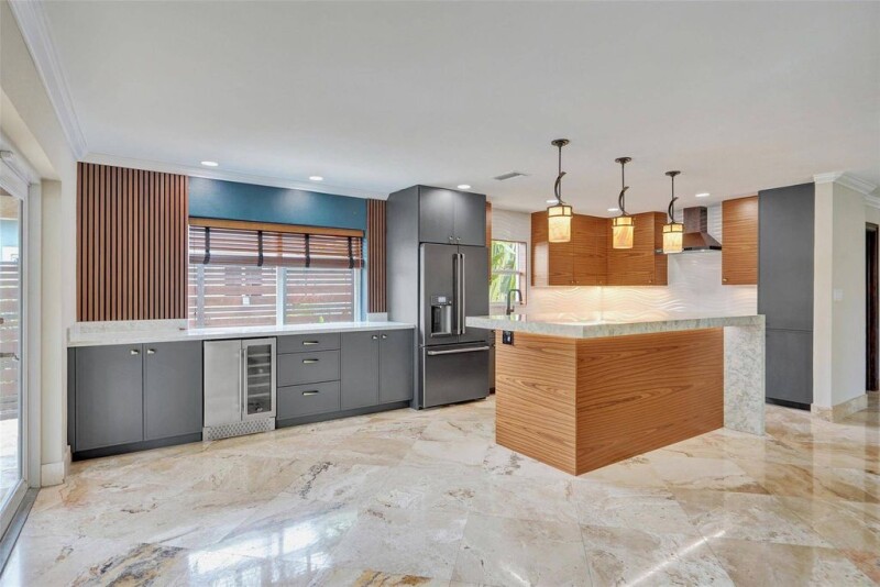 SPECTACULAR SUNSETS! NEW 2024 ROOF! This sleek East Wilton Manors waterfront home boasts designer touches throughout its 3,628 sqft. Enter through grand mahogany double doors to stunning water & pool views. The home features diagonal travertine marble floors, an open floor plan, gourmet kitchen built in 2022 w/Cambria quartz countertops, 4'x8' island, high-end appliances, & 42"solid wood cabinets. It includes a main-level office/4th bedroom, high-impact windows/doors, saltwater heated pool w/Turkish gold terrazzo floors, & a covered lanai. The home offers 70' of waterfront, 60' dock w/boat/jet-ski lift, tiki hut, 2-car garage, circular driveway & landscaping. This is the epitome of luxury & functionality, perfect for those seeking a waterfront lifestyle w/modern convenience.