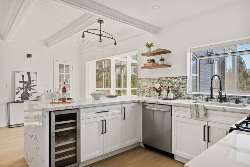 Perched in the trees and with peaks of Lake Arrowhead sits this freshly remodeled mountain home. An open concept, main floor and a sunroom with soaring windows are the welcoming features of the home. Enter into a beautiful main living space, with a stone fireplace and views out over the trees. The sunroom that can also act as the dining room lets in beautiful natural light and sparkles of the lake through the trees. The main level also boasts a fully remodeled kitchen with clean finishes, stainless steel appliances and expansive views. Rounding out the space is a cozy bedroom and remodeled bath. The upstairs is home to the perfect primary retreat. Vaulted ceilings and a centerpiece stone fireplace create a unique special feel for the space. A spa-like ensuite bath with luxury finishes is the perfect compliment to the room. In addition, the upper level has a second guest bedroom and additionally remodeled bath. The lowest level of the home features a desired bonus and extra sleeping room. Two large and adjacent rooms create an ample amount of bonus living space, with bright natural light and access to two exterior decks. This area is perfectly used as a second living room, game room, theater, bunk room or more! For prime mountain enjoyment, the home has multiple decks on different levels and several unique outdoor living spaces. All new decks, paint and parking provide easy and convenient use. Conveniently, the home is located close to Tavern Bay Beach Club, the national forest and the town of Blue Jay. Sited on the quiet side of the lake, this LAKE RIGHTS home is the perfect mountain retreat.