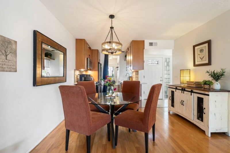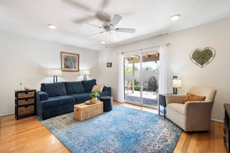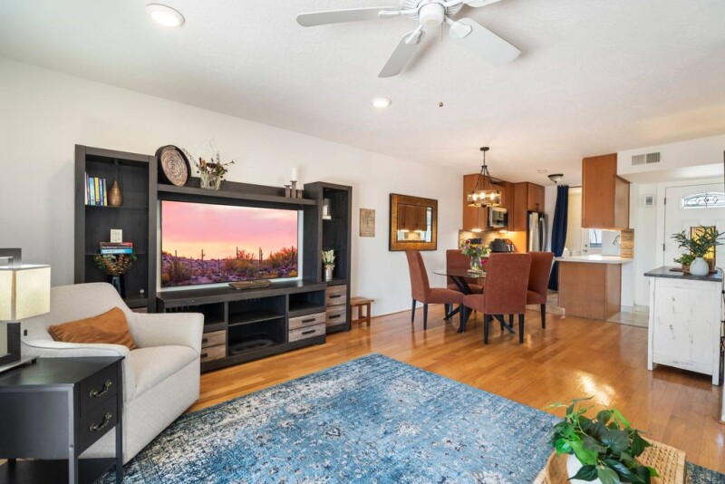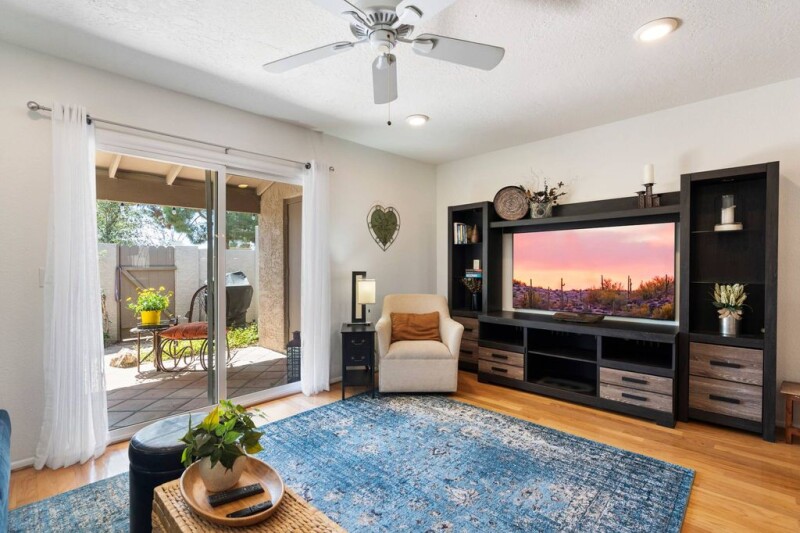 Private courtyard entry with lush vegetation creates a peaceful refuge. Meticulously maintained with everything in like new condition. Beautifully remodeled single level patio home with high-end finishes throughout. Upgraded lighting, fixtures and flooring. Pella dual pane windows and doors. The open great room floor plan with 2 Bedrooms and 2 Bathrooms unites the home's interior with the outdoors and covered patio. Chef's kitchen with access to the front courtyard features quartz counters, tile backsplash, updated cabinets, under counter lighting, pantry, convection cooktop, and all new appliances. The great room is open to the kitchen and features hardwood flooring, and overlooks the private south facing patio and backyard oasis with access to the common area. The primary suite has access to the backyard and is complemented by a walk-in closet, custom tiled walk-in shower with custom glass sliding shower door and custom vanity and lighting. The Guest bath features a custom tile tub/shower and vanity with updated lighting and custom mirror. Large laundry room with cabinets includes a washer and dryer and access to the front courtyard. Resort style amenities including: Lush landscaping, common areas and within walking distance to the Community Pool. Great location with plenty of green spaces, mature trees and hiking trails nearby. Gorgeous mountain views. Close to dining, shopping and easy access to freeways.