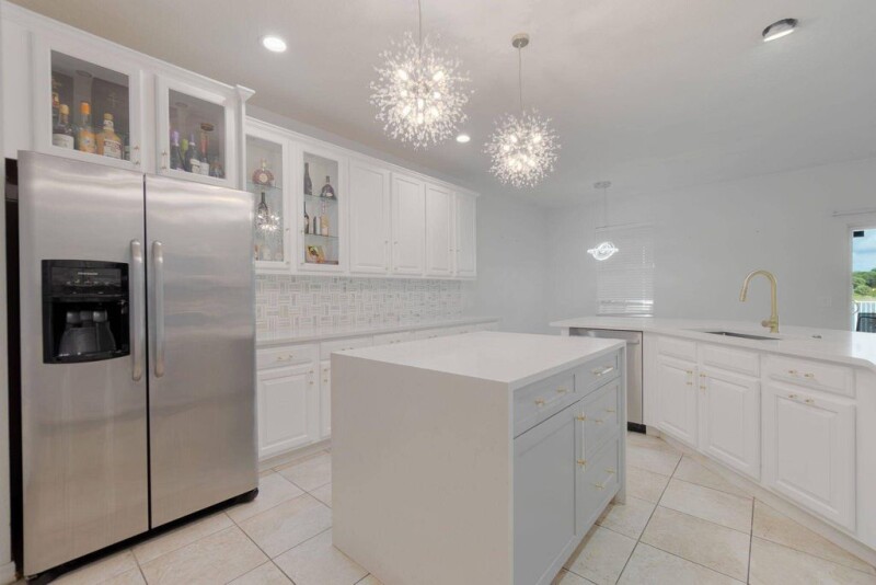 Spacious 4/3.5 with the master bedroom downstairs. Remodeled kitchen with quarts countertops with an island for extra space and storage, cabinets and appliances. Plenty of living space with a living room, breakfast area with an open kitchen, formal dining room and a den or family room with an electric built in fireplace. Updated light fixtures. Master bedroom is downstairs with views of the lake. Large covered screened patio with pavers that extend in the back yard. Upstairs you will find 3 bedrooms with an office area and loft. Laminate floors upstairs with tile on the main floor and a newer AC. TV on the patio does not convey.