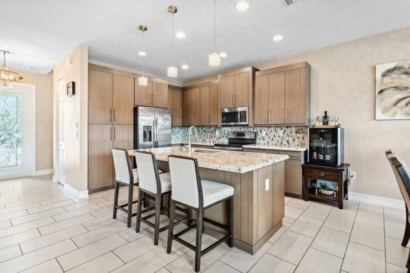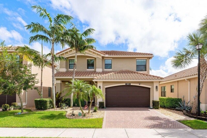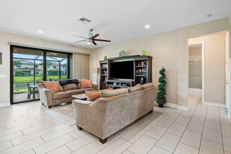 Former snow bird's home, shows like a model! 2300+SF Verona model on lake with extended patio and screen enclosure. One bedroom & bathroom downstairs. Primary bedroom with oversized walk in closet is upstairs along with two additional bedrooms, and bonus loft. Impact doors and windows throughout. Meticulously maintained. Tuscany offers a manned security gate, amenities and low HOA. Enjoy the community resort style pool, playground, splash pad, tennis courts and more. Quick drive to downtown Atlantic Ave and beach.