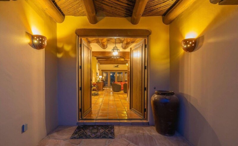 Discover the epitome of authentic Southwest charm in this stunning Ray Birch-designed Santa Fe home, perfectly positioned on a private hillside lot in prestigious Alta Vista. Spanning 3,747 square feet, this exquisite property showcases panoramic views of the city skyline and breathtaking mountains, offering both tranquility and inspiration. Step inside and be captivated by the home's distinctive warmth, characterized by artisan-crafted saguaro ribs, viga-beamed ceilings, and beautifully textured imperial plaster walls. Elegant Saltillo tile flows seamlessly throughout, accentuating handcrafted niches and unique architectural details. The spacious gourmet kitchen is an entertainer's dream, complete with a Sub-Zero refrigerator, generous sized island, granite counters, and custom cabinetry. Hosting is effortless with a thoughtfully designed floorplan that includes separate living and family rooms, and a formal dining room. Adjacent to the family room, you'll find an inviting wet bar area featuring a beverage refrigerator. The expansive primary suite provides a luxurious retreat, boasting a comfortable sitting area, ample closet space, and a spa-like bathroom. Off the primary suite, enjoy the added convenience of a dedicated office/den space with its own private balcony. Accommodating family and friends is a delight thanks to two additional bedrooms and a separate guest quarters, fully equipped with its own private bath. Outside, the home comes to life with sweeping city lights and mountain vistas, creating the perfect backdrop for relaxation or gatherings beneath the stars. The backyard enhances the outdoor living experience with built-in BBQ and a sparkling pool/spa, perfectly positioned to overlook the spectacular city views.