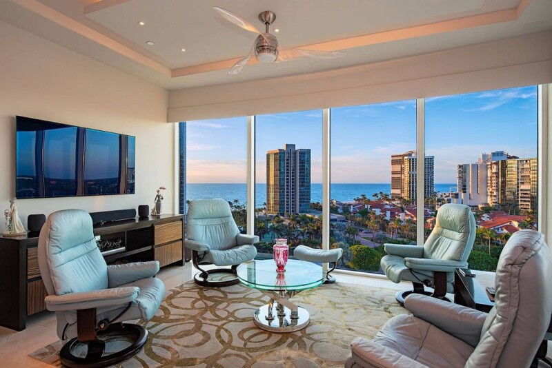 This spectacular three-bedroom, three-bath residence is artfully designed with an expanded floor plan and uncompromising 200-degree views of the gulf, bay and city. Roz Travis Interiors masterfully curated this extraordinary 10th-floor gem. Spanning 3,381 square ft with coffered 10-foot ceilings, window walls of glass, two outdoor terraces, one screened and shuttered terrace, an open gourmet kitchen with wine storage and top-of-the-line appliances and custom built-ins, this residence offers the finest in luxury coastal living. Aria is the newest beachfront building with an array of amenities, including 24-hour security, a billiards room, stylish club room, private dining room, men's and women's spa areas, massage room, fitness room, two elegant guest suites, and a beachside pool with a spa, covered bar area and barbecue grills. The building is well-staffed and meticulously kept, maintaining a status in keeping with its reputation of being one of the most sought-after addresses on Gulf Shore Boulevard.
