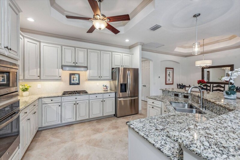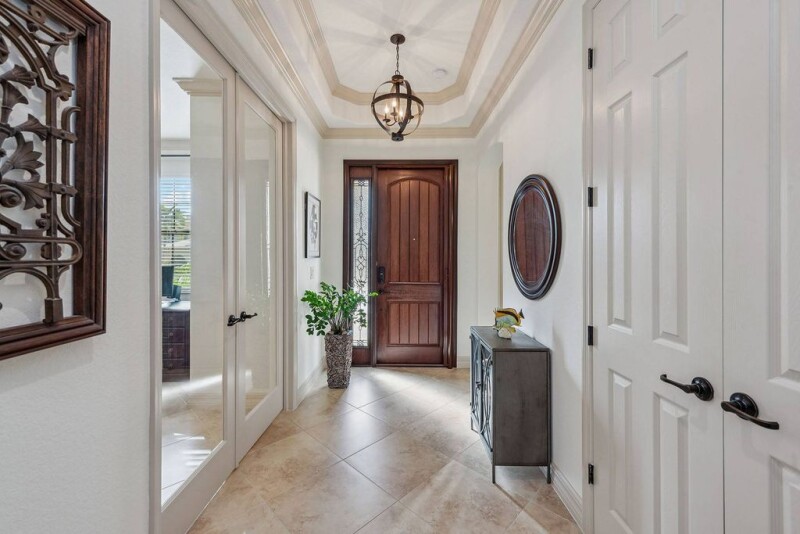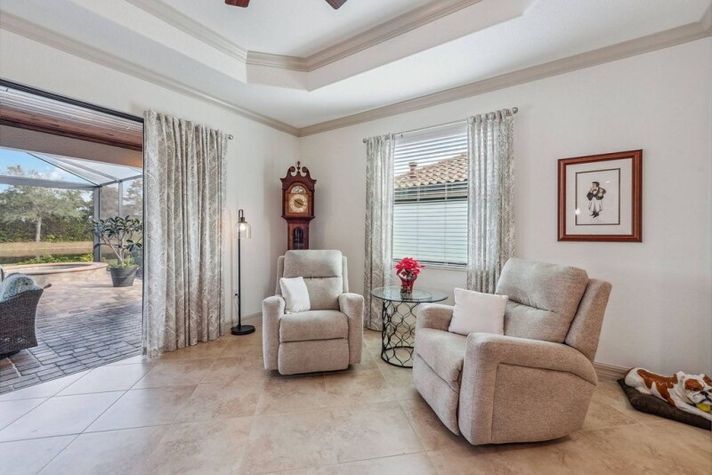 Introducing an immaculately maintained home in the popular Millbrook neighborhood of sought-after Fiddler's Creek, offering a peaceful location. This elegant house offers serene, private water views and a stunning outdoor living area, making it the ideal retreat to enjoy the ideal Florida lifestyle. This beautifully designed residence features three bedrooms, 2.5 baths and a spacious great room with tray ceilings, crown molding, custom paint and impact glass throughout. New tankless water heater, refrigerator and dishwasher. The open kitchen is a chef's dream, boasting high-quality stainless appliances, natural gas cooking, premium cabinetry with pullouts, wall oven, French-door refrigerator, a walk-in pantry and granite countertops, creating a space for entertaining and everyday living. The main suite is a tranquil haven with serene lake views, a custom walk-in closet and a spa-like en-suite bath featuring dual vanities, a walk-in shower and a soaking tub. The guest rooms offer flexibility and comfort for additional guests or work-from-home needs. Tile floors throughout, with no carpet, for easy maintenance. The outdoor living space is a highlight of this home, designed for relaxation and entertaining. The expansive screened lanai includes a gas-heated pool and spa, upgraded fans, a fire pit table, and a custom wood ceiling over the outdoor kitchen and lounge area, all protected by panoramic screens to maximize beautiful water views. Additional features include a whole-home generator installed in 2023, motorized storm screens outside the covered lanai, privacy film on the windows, custom closets with extra shelving, a freshly painted interior and exterior, tile roof, lush landscaping and a long paver driveway leading to a two-car garage with epoxy flooring and built-in cabinets. Residents of Fiddler's Creek enjoy world-class amenities, including access to resort-style pools, a clubhouse with fine and casual dining, spa services, a state-of-the-art fitness center with trainers and classes, and active tennis and pickleball programs, bocce, steam room, sauna, and an extensive activity and event calendar with something for everyone. Optional memberships to the newly renovated golf course, new golf clubhouse, beach, and marina further enhance this luxurious lifestyle. Gated community with ample sidewalks for walking, running or bicycling. Conveniently near downtown Naples and Marco Island, including shopping, dining, beaches, executive airport, kayaking, paddleboarding and all Southwest Florida attractions, this home presents an exceptional opportunity to experience the best of Florida's luxury living.