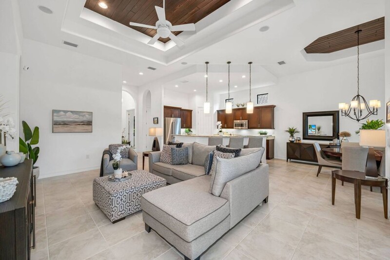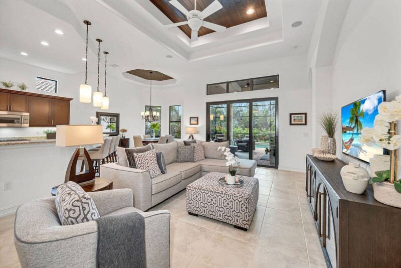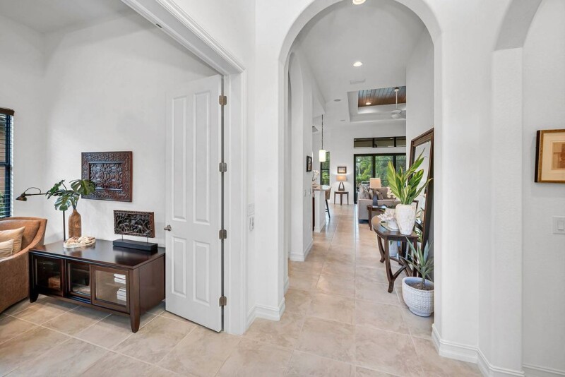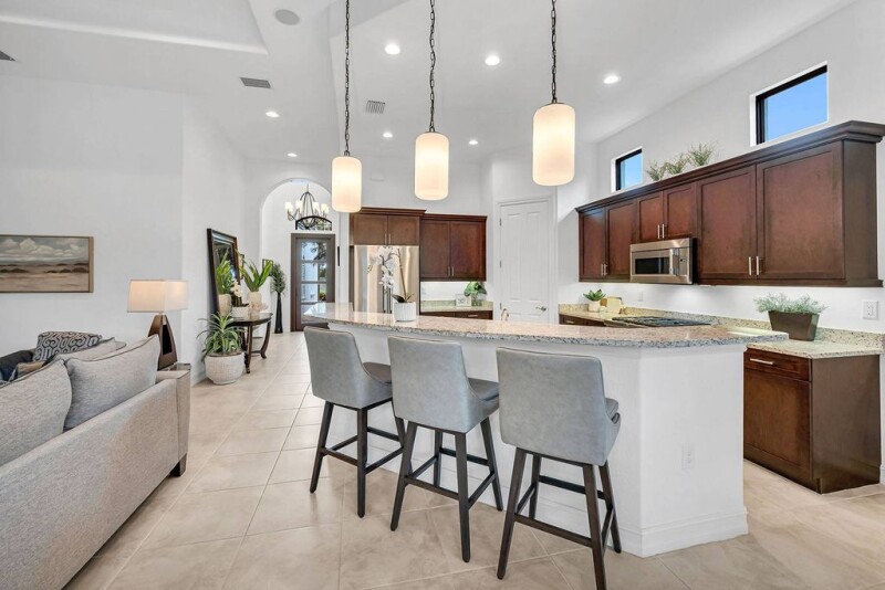 On one of the largest lots in the neighborhood, this beautifully upgraded, furnished Tivoli III floor plan home in Lakoya at Lely Resort offers an unparalleled blend of luxury, privacy and tropical tranquility. Set amid lush palm trees and meticulously updated landscaping, this saltwater pool home is a retreat, ideal for relaxation and entertaining. With three bedrooms plus a den, three baths and a two-car garage, this residence boasts spacious, open-concept living with volume ceilings, arched doorways and elegant cypress wood ceiling accents throughout. Hurricane impact doors and windows provide peace of mind, while new exterior and interior paint in 2024 adds a fresh, modern touch. The open kitchen is a chef's dream, featuring shaker-style cabinetry, granite countertops, recessed and under-cabinet lighting, and a large island with a breakfast bar and pendant lighting. Recently upgraded Thermador stainless steel appliances, including a gas range, microwave, French door refrigerator and freezer, and dishwasher, come with a five-year extended warranty. A walk-in pantry offers ample storage, ensuring style and functionality. The dining area, framed by a bay window with garden views, seamlessly flows into the great room, which is enhanced by a tray ceiling, built-in speakers and glass sliders that open to the lanai. The owner's suite is a private retreat, offering picturesque views, bay windows and direct access to the lanai. Two walk-in closets with built-in shelving provide exceptional storage, while the spa-like en-suite bath features dual vanities with granite countertops, a full-width mirror, a walk-in shower with a frameless glass enclosure, and a separate soaking tub. Two guest rooms share a beautifully appointed full bath with a granite vanity and a shower-tub combination, while an additional hallway bath features a walk-in shower. A versatile den with a double-door entry can be used as a home office or converted into a fourth bedroom. The expansive lanai is designed for resort-style outdoor living, complete with a tongue-and-groove cypress wood ceiling, recessed lighting, a ceiling fan and brick paver flooring. The new outdoor kitchen, featuring a built-in barbecue, mini refrigerator and granite countertop, makes entertaining effortless. The saltwater pool, upgraded with newer pool equipment, offers a serene setting with private garden views surrounded by lush tropical landscaping. Additional features include a dedicated laundry room with a Speed Queen front-load washer and dryer with seven-year warranty and a utility sink, as well as a two-car garage with durable epoxy flooring. In Lakoya at Lely Resort, this home includes immediate membership to The Players Club and Spa, offering resort-style pools, a fitness center, tennis, pickleball, bocce a full-service spa and dining. Golf enthusiasts enjoy private access to The Classics course and two public courses, Mustang and Flamingo. Schedule your private showing today!.